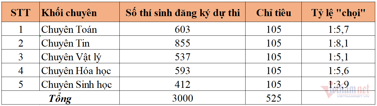 Cụ thể, với 855 hồ sơ đăng ký dự thi, trong khi số chỉ tiêu là 105, tỷ lệ chọi của khối chuyên Tin học lên đến 1/8,1; tức 8 em dự thi chỉ lấy 1. Xếp thứ hai là khối chuyên Toán với 603 hồ sơ đăng ký dự thi, tỷ lệ chọi là 1/5,7. Khối chuyên Sinh học có tỷ lệ chọi thấp nhất 1/3,9.