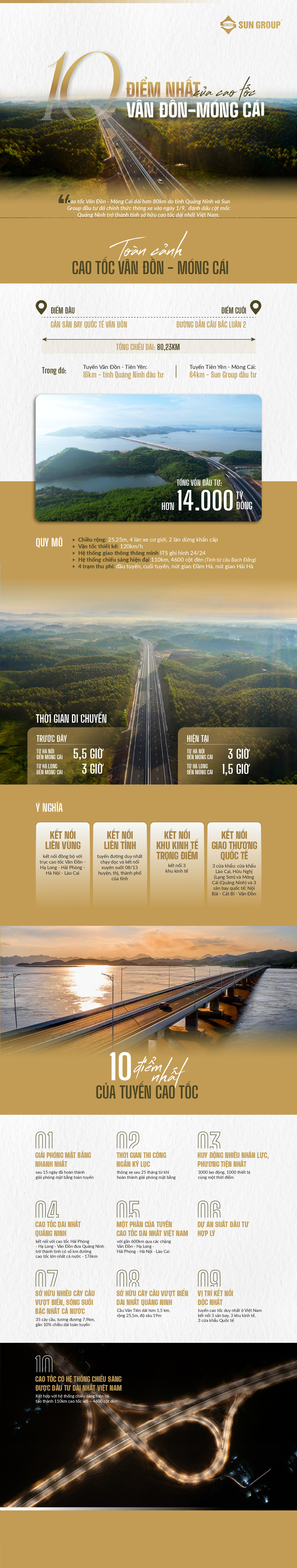 Cao tốc Vân Đồn - Móng Cái do tỉnh Quảng Ninh và Sun Group đầu tư đã thông xe vào ngày 1/9, đánh dấu cột mốc đưa Quảng Ninh trở thành địa phương có số ki-lô-mét đường cao tốc dẫn đầu cả nước.