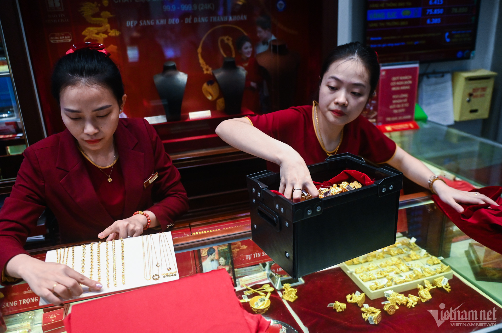 Bên trong cửa hàng vàng, các nhân viên hôm nay đến sớm, tất bật bày sản phẩm ra kệ.