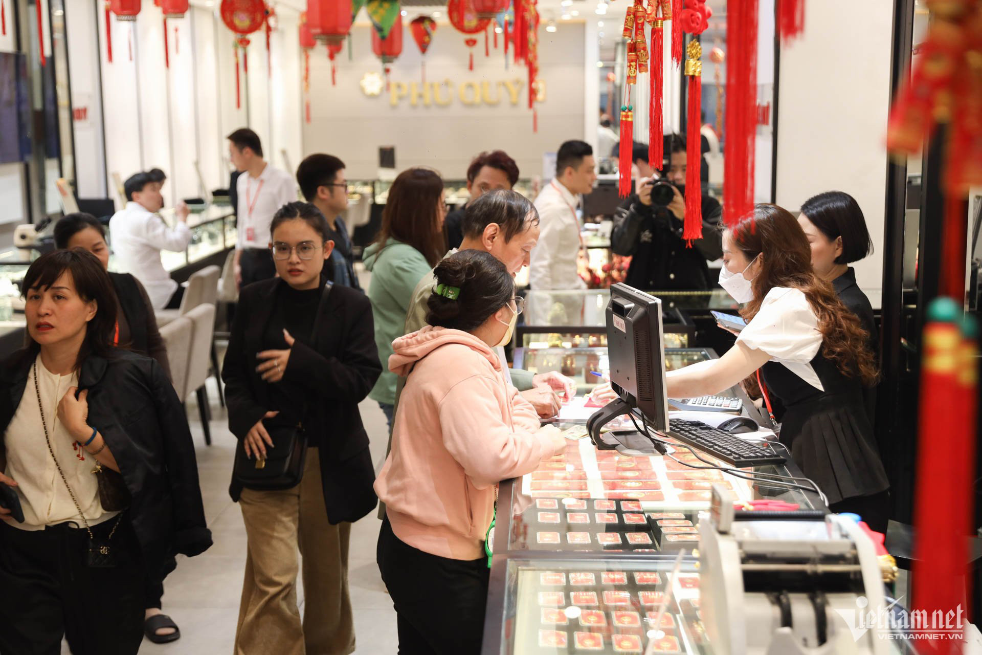 Các tiệm vàng trên phố Trần Nhân Tông đều đông đúc khách từ tinh mơ. Nhiều khách muốn trở thành người đầu tiên mua được vàng ngày Thần Tài.
