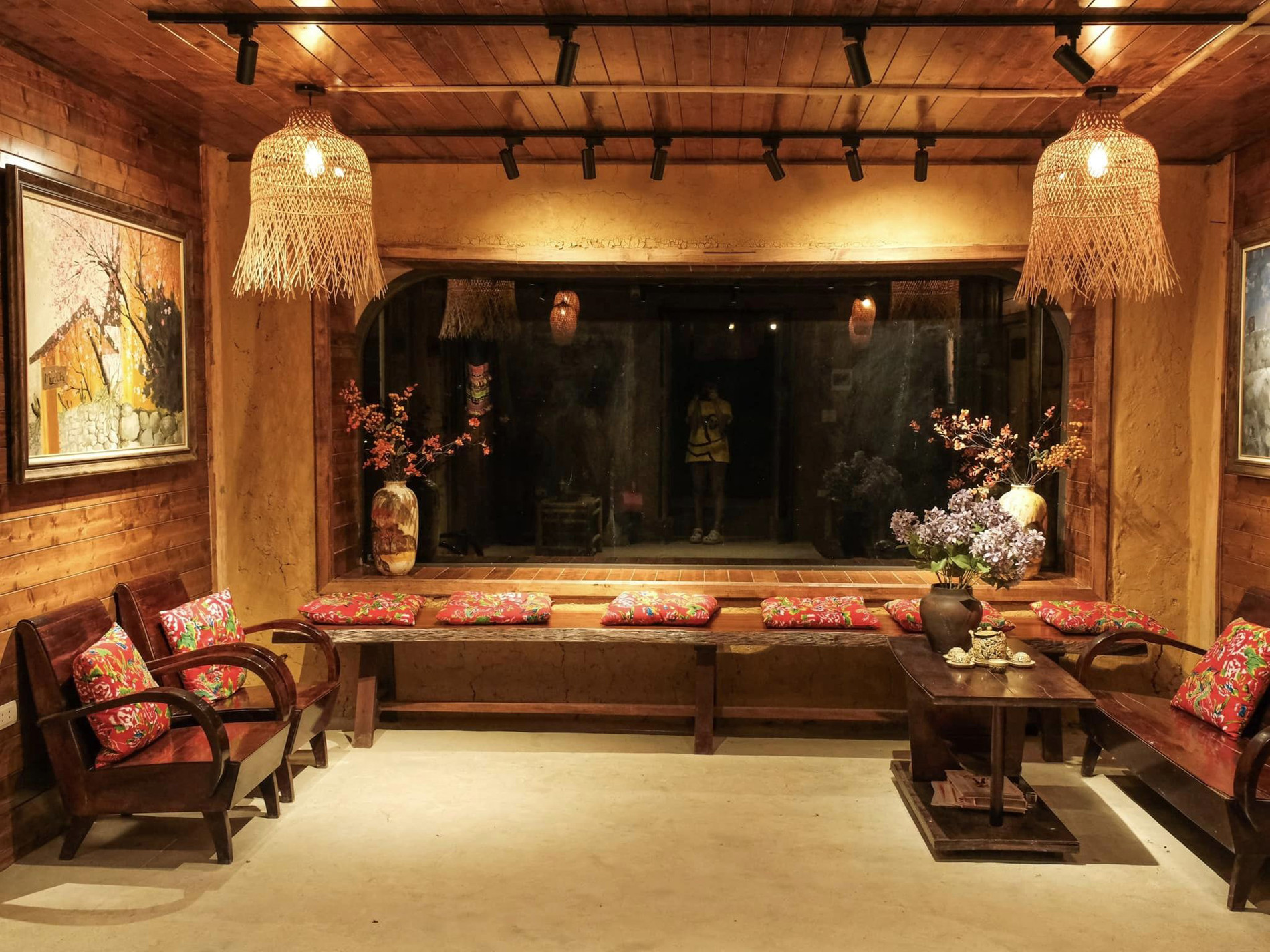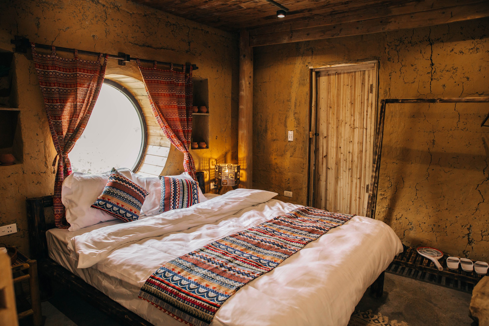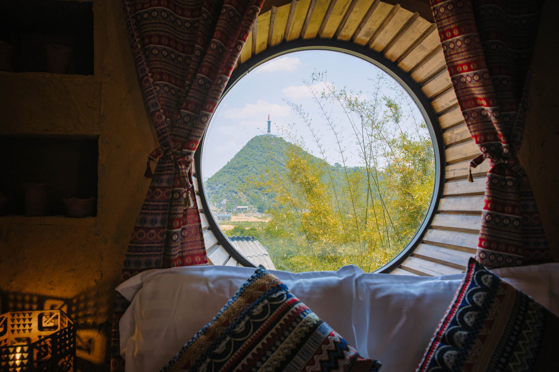 Với ô cửa sổ hình tròn có tầm nhìn thẳng ra cột cờ Lũng Cú, Phượng cho biết phải đục tường đất dày cỡ 50cm, sau đó lắp kính cường lực vào rồi ốp gỗ xung quanh để đảm bảo an toàn mà vẫn thẩm mỹ.