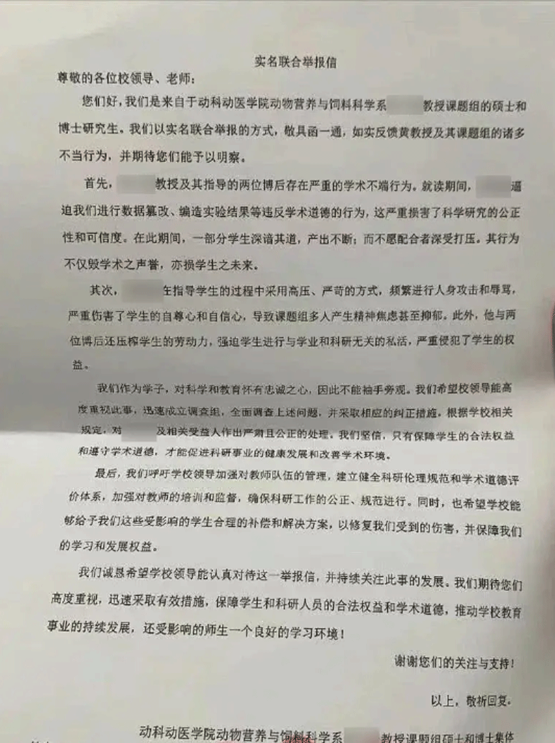 Ngày 16/1/2024, 11 sinh viên Trường Đại học Nông nghiệp Hoa Trung đã cùng nhau tố cáo rằng GS Hoàng thuộc Khoa Dinh dưỡng Động vật của trường đã có hành vi gian lận trong học thuật. Một số bài báo khoa học của ông bị cáo buộc giả mạo dữ liệu thực nghiệm, làm sai lệch các bức ảnh thực nghiệm và đạo văn.