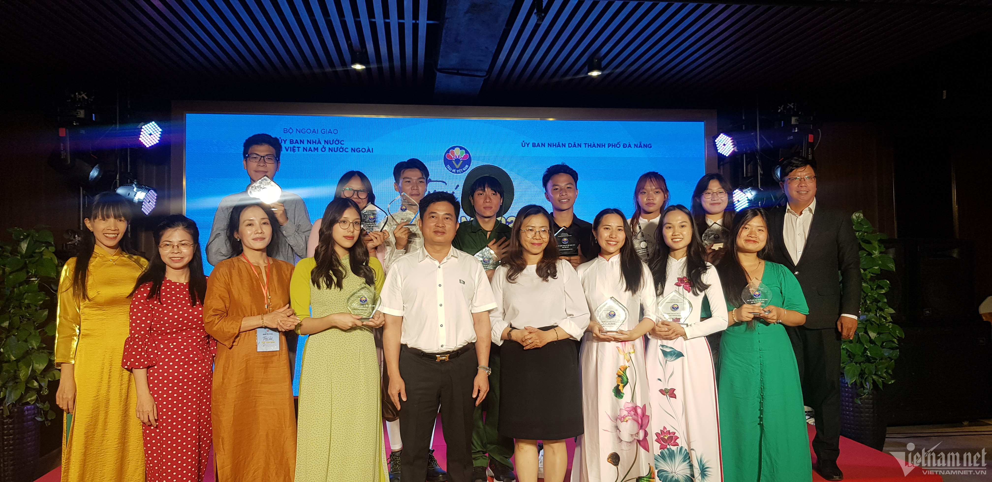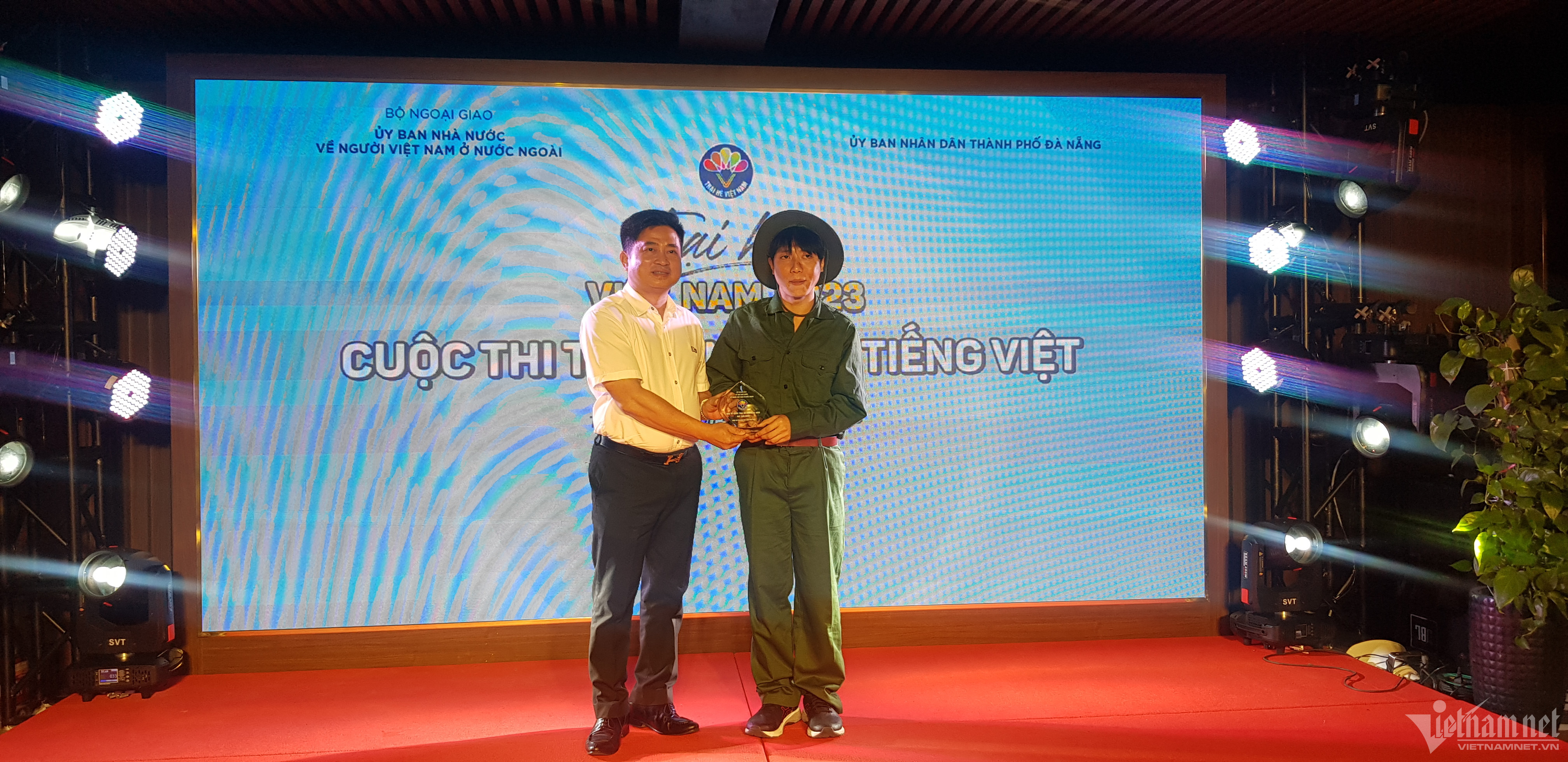 Ông Đinh Hoàng Linh - Vụ trưởng Vụ Thông tin – Văn hóa, Ủy ban Nhà nước về Người Việt Nam ở nước ngoài trao cúp lưu niệm cho thí sinh giành được giải Nhất.