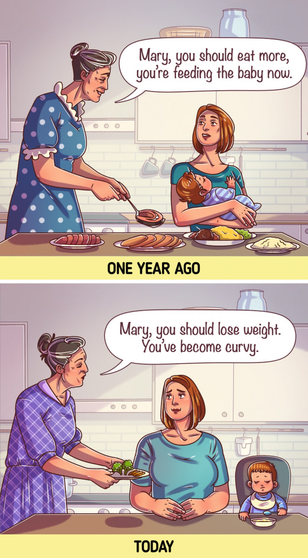 Nhiều người thân lớn tuổi thường khuyên các bà mẹ cho con bú phải ăn nhiều hơn để sữa mẹ béo hơn, nhưng sau đó lại bắt đầu phàn nàn rằng người phụ nữ này trông không giống Gisele Bündchen.