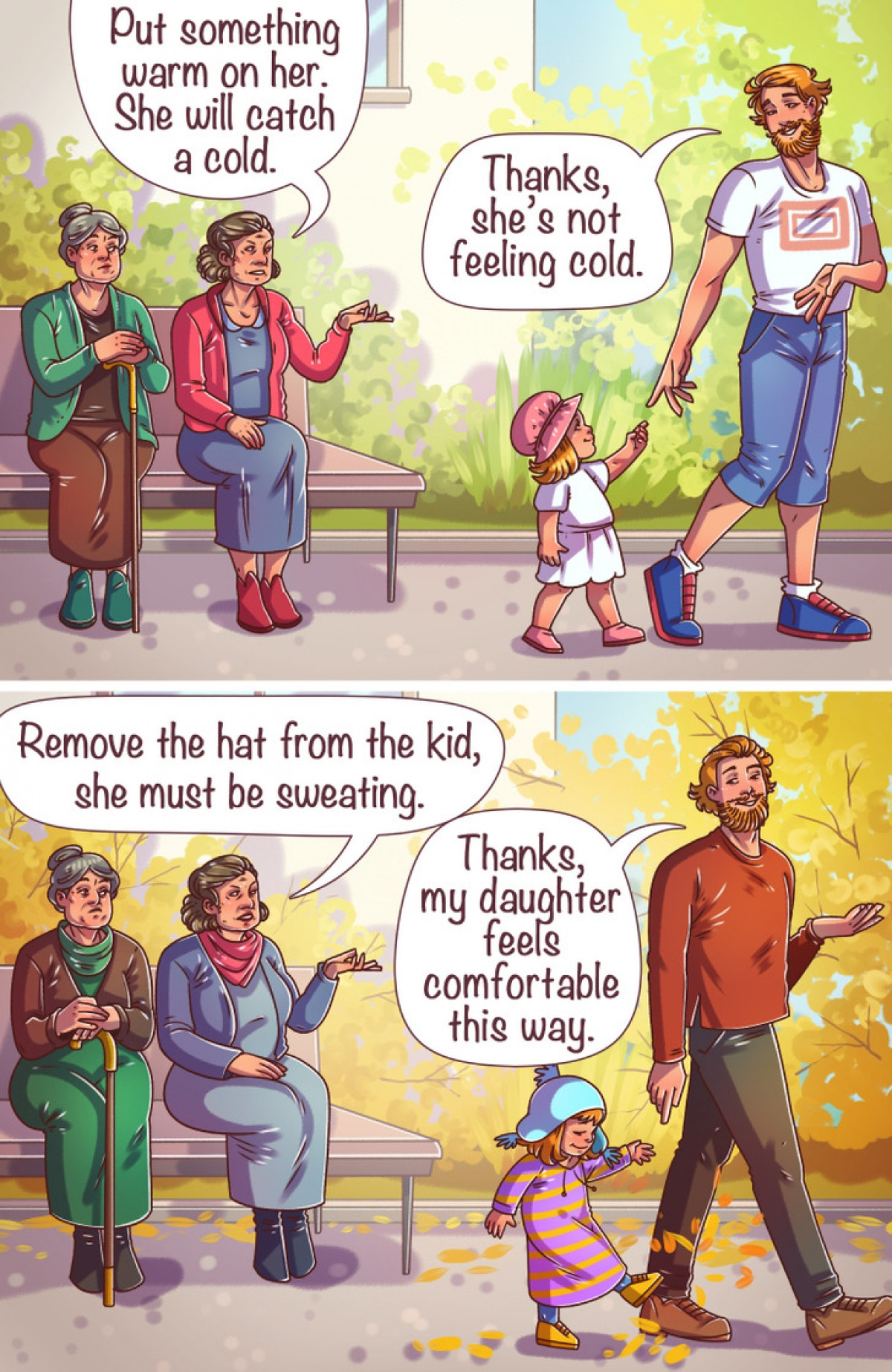 Không ai nhận xét người lớn về việc quần áo họ đang mặc không phù hợp với thời tiết. Nhưng đồng thời, nhiều người lớn vui mừng cho rằng họ hiểu rõ các đặc điểm và cho con mình ăn mặc không đúng.