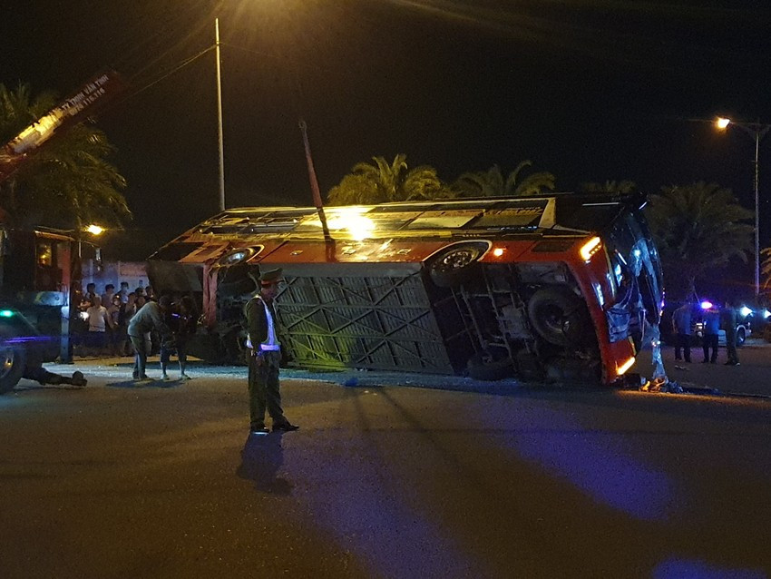 Xe khách bị lật sau cú va chạm với xe tải. |
