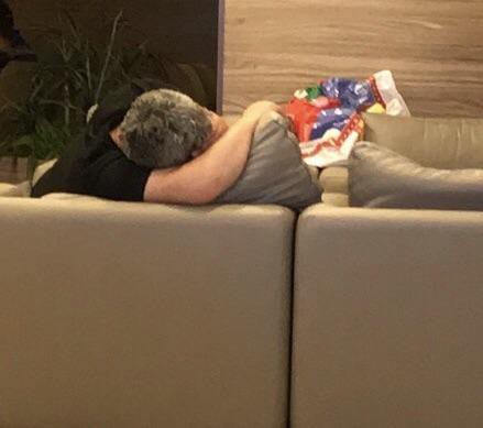Một cặp đôi ôm nhau ngủ vì máy bay delay? Không phải, nhìn mãi mới nhận ra gã đó đang ôm cái gối!