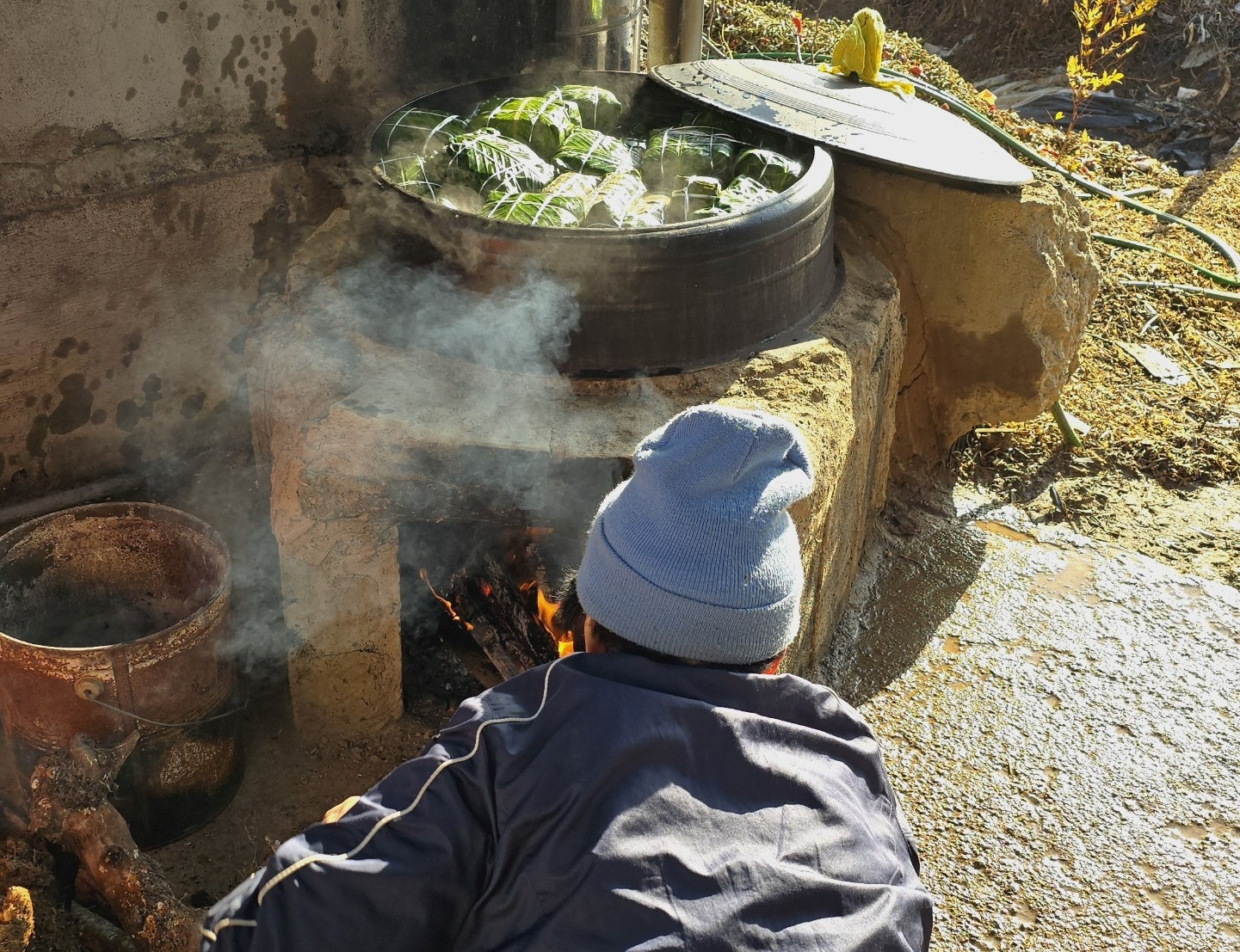 Bà không biết gói bánh chưng nhưng rất hào hứng, xung phong nhóm lửa, xách nước đổ vào nồi… Trong lúc chị Thái gói bánh, chồng chị là người buộc dây, bê bánh đem luộc.