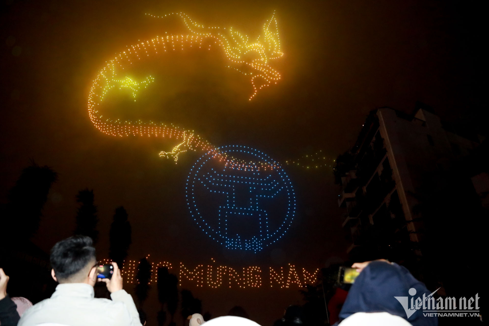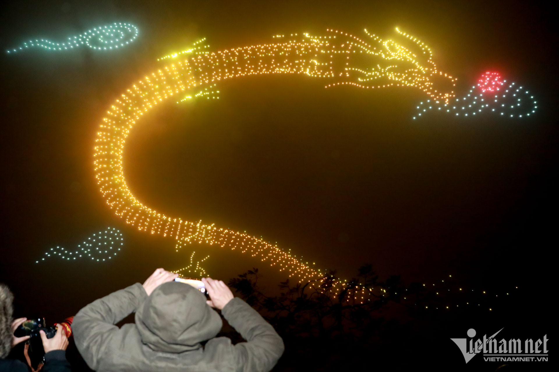 Hình ảnh rồng Thăng Long rực rỡ trên bầu trời do những chiếc flycam phát sáng tạo nên.