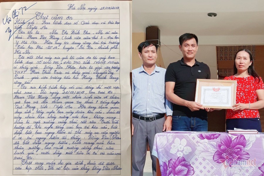 - Người mẹ đã viết thư tay bày tỏ lòng biết ơn, cảm kích đến ngành giáo dục Nghệ An và 2 giáo viên đã bất chấp nguy hiểm để cứu con trai mình thoát khỏi đuối nước.