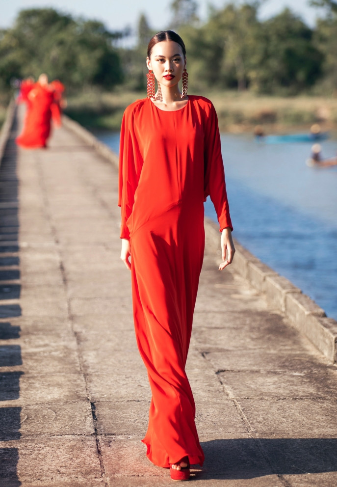 20 người mẫu diện những trang phục đỏ rực rỡ, catwalk trên địa danh nổi bật ở miền Trung. “Khi đến Quảng Nam, chúng tôi ấn tượng về vẻ đẹp yên bình, tạo nhiều cảm hứng. Ê-kíp quyết định chọn địa danh này thực hiện show", Vũ Ngọc và Son nói.