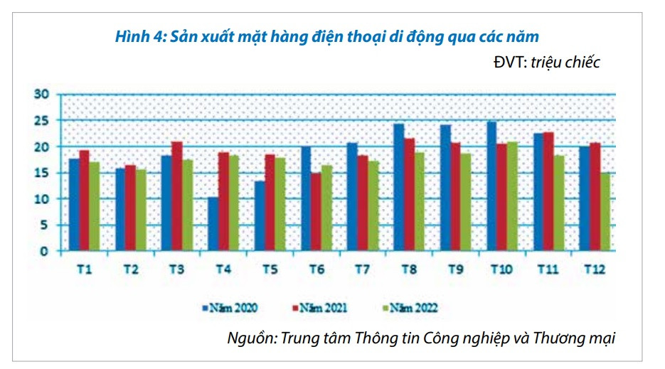 Báo cáo xuất nhập khẩu năm 2022, được Bộ Công Thương công bố ngày 27/4, cho thấy, trong năm 2022, số lượng điện thoại sản xuất ước đạt khoảng 210,5 triệu chiếc, giảm 9,1% so với năm 2021. Trị giá sản xuất linh kiện điện thoại đạt khoảng 663,7 nghìn tỷ đồng, tăng 15,1% so với năm 2021.