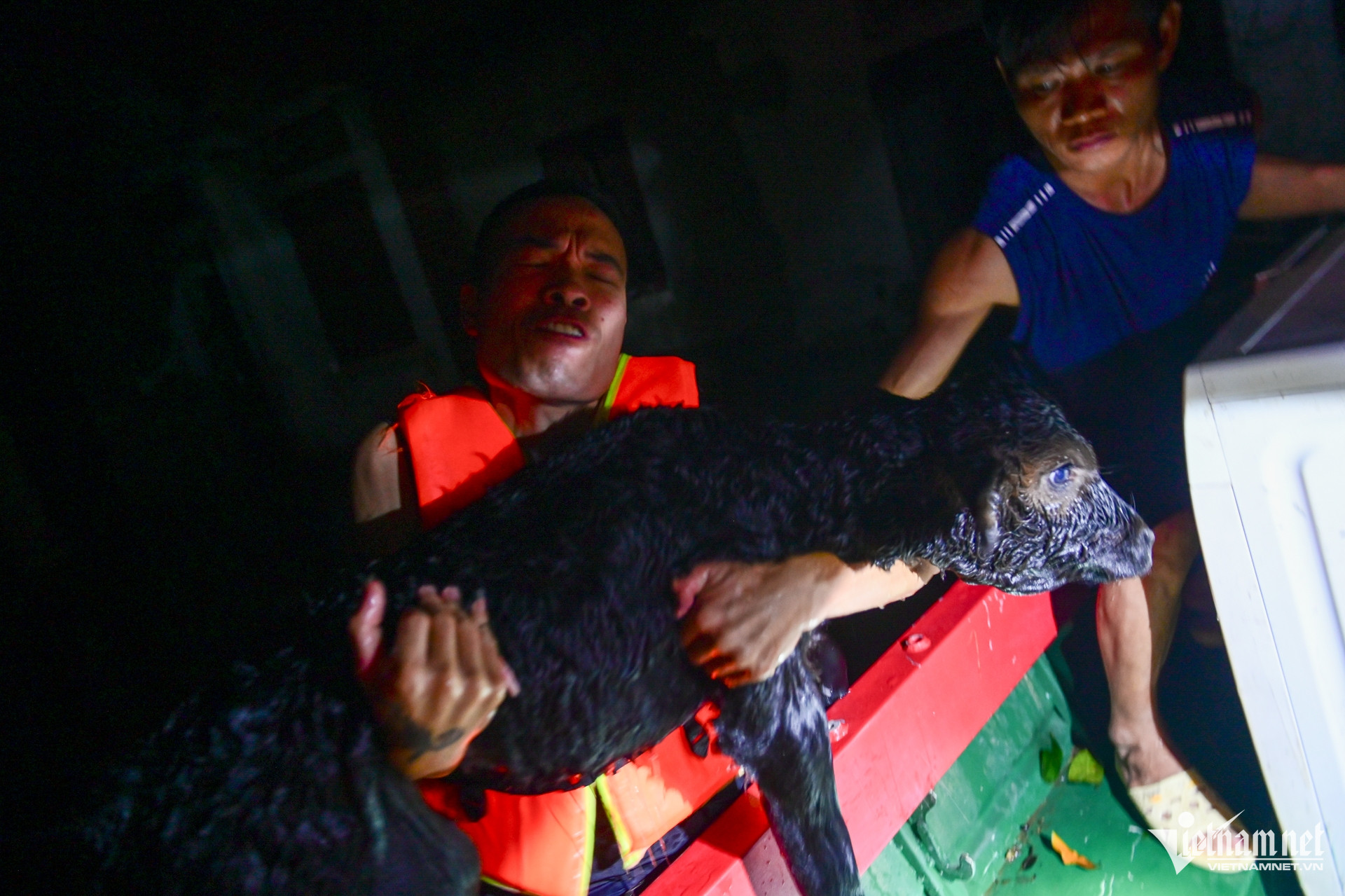 Trong ánh sáng ít ỏi còn lại của 2 chiếc đèn pin, 6 người đàn ông vật lộn để dẫn bò ra ngoài. Riêng bò mẹ mới sinh sức yếu, không chịu đi, ông Hưng cùng con rể phải phối hợp vừa kéo vừa thương. "Ngập này lo cho nó nhất", người đàn ông trung niên không giấu nổi nghẹn ngào.