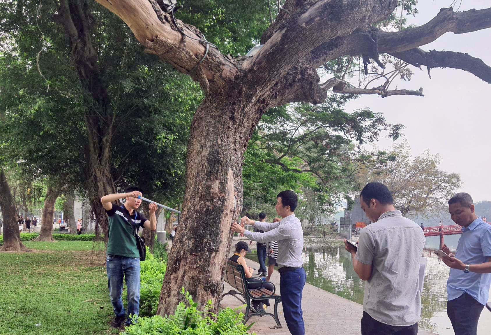 Ba cây sưa chết khô bên bờ hồ Hoàn Kiếm có đường kính từ 35 - 60cm. Cụ thể, cây sưa chết từ năm 2019 nằm đối diện phố Lò Sũ - Đinh Tiên Hoàng có đường kính 59cm, cao 10-12m.