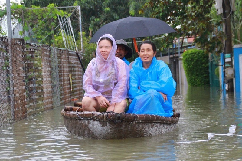 Đến hơn 16h chiều 24/10, nhiều khu vực ở Quảng Nam vẫn ngập sâu. Tại khu phố Phương Hòa Tây, TP Tam Kỳ ngập từ 1m đến 1,5m, người dân phải di chuyển bằng thuyền thúng...