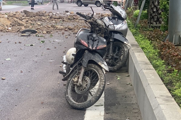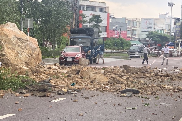 Hiện trường vụ sạt lở có nhiều tảng đá sau khi rơi xuống đường đã bị vỡ thành nhiều khối nhỏ, nằm ngổn ngang dưới đất. Vị trí xảy ra vụ sạt lở đá nằm ngay cửa ngõ ra, vào trung tâm TP Quy Nhơn.