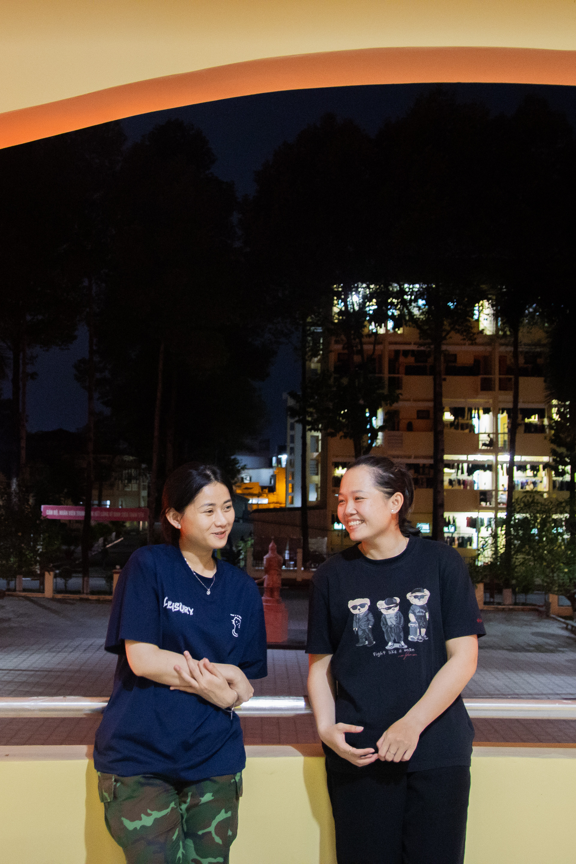 Nhi đứng trò chuyện cùng Thảo Nhu, hai cô gái khối trưởng trong quá trình cùng sinh hoạt, luyện tập 3 tháng qua đã trở nên thân thiết.