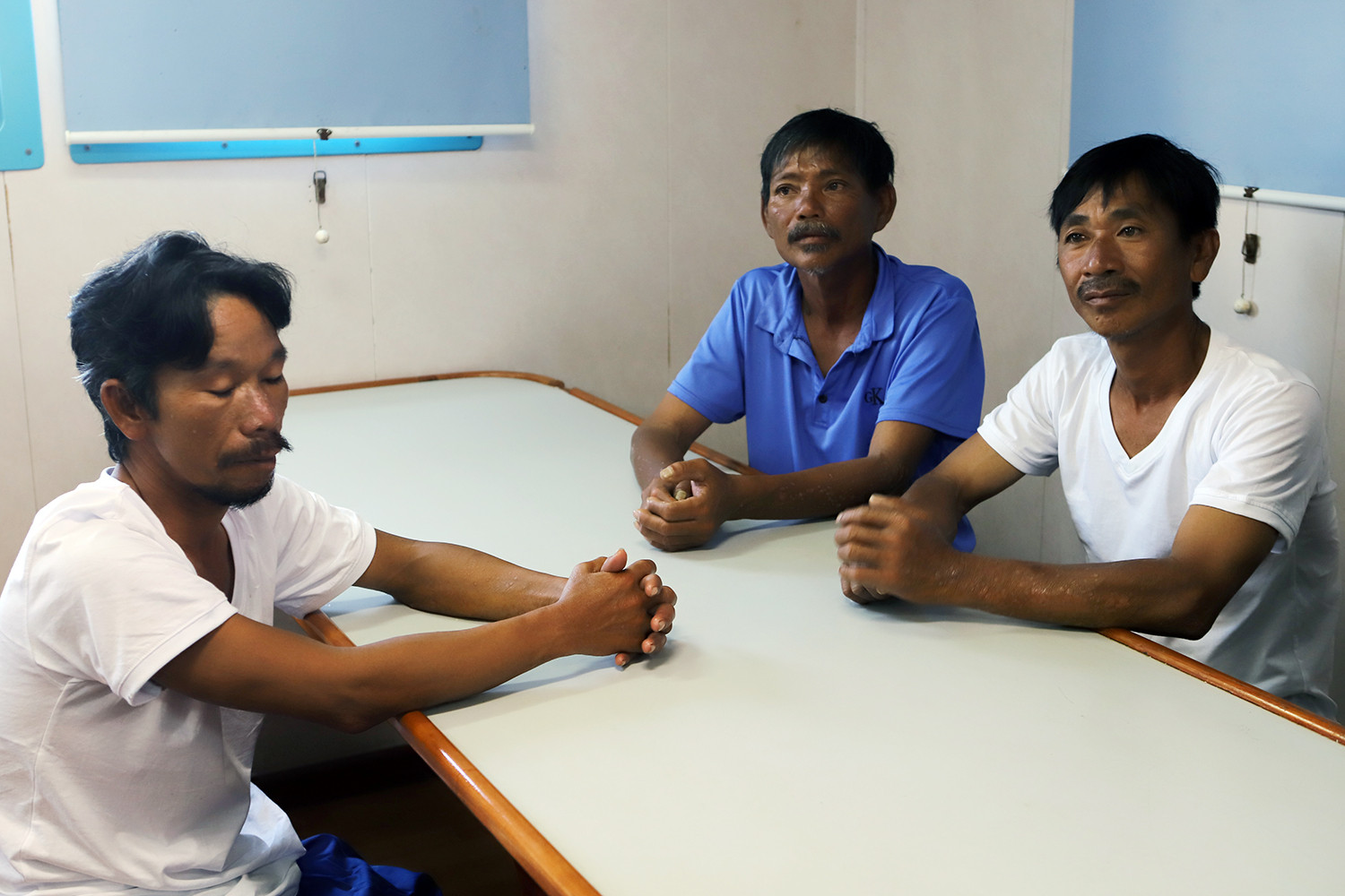 Đây là bốn thuyền viên trong nhóm 15 ngư dân đánh bắt cá của ông Bùi Văn Toàn, 50 tuổi, quê Phan Thiết, tỉnh Bình Thuận, làm thuyền trưởng. Tàu dài hơn 19 m, có công suất 310 CV, xuất bến Phan Thiết ra vùng biển Trường Sa đánh cá ngừ, từ ngày 21/6.
