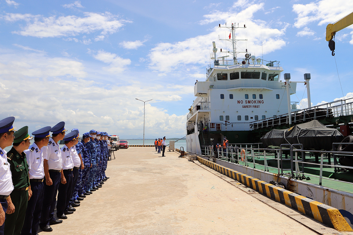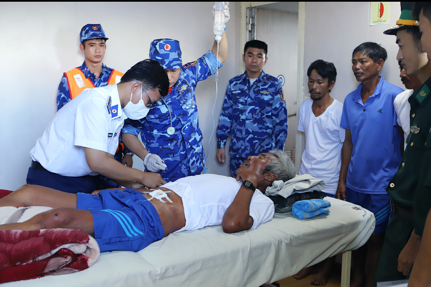 Chiều 21/7, tàu Cảnh sát biển 7011 thuộc Hải đoàn 32, Bộ Tư lệnh Vùng Cảnh sát biển 3 đưa 4 ngư dân của tàu cá Bình Thuận bị nạn vào đất liền tại thị xã Ninh Hòa (Khánh Hòa), chuyển đến bệnh viện kiểm tra sức khỏe.
