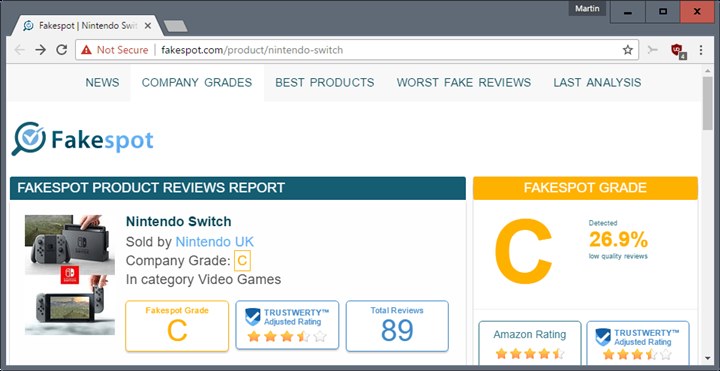 Fakespot, dịch vụ theo dõi các bài đánh giá trên Amazon và Walmart, sẽ xếp loại cho các bài viết về sản phẩm. Chữ D có nghĩa là từ 40% đến 70% đánh giá được đưa ra là giả mạo, chữ F sẽ cảnh báo người dùng rằng hơn 70% là bị nghi ngờ mạo danh. Công ty cho biết hơn 20 triệu người dùng đã sử dụng Fakespot kể từ khi họ ra mắt vào năm 2015 - một minh chứng cho việc người mua hàng dựa vào đánh giá và xếp hạng để quyết định chọn mua sản phẩm nào.