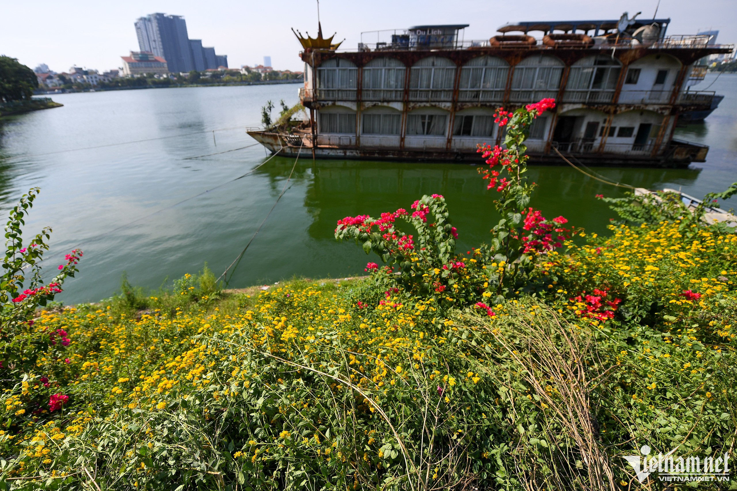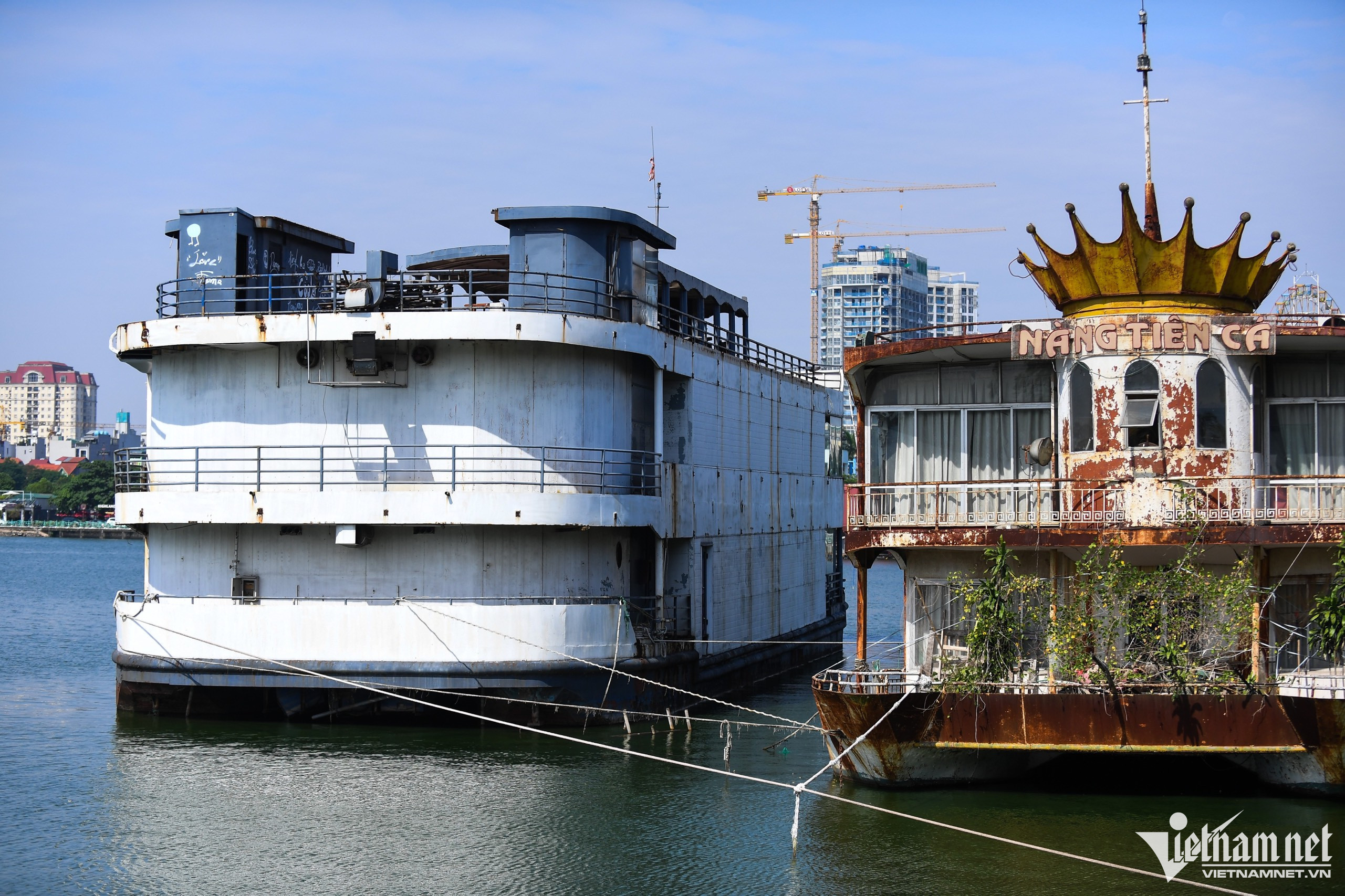 Những chiếc du thuyền bị bỏ hoang lâu ngày chuẩn bị được phá dỡ. Đây vốn là những nhà hàng nổi đưa thực khách dạo chơi ngắm cảnh vòng quanh hồ Tây nhiều năm trước.Tất cả chúng đều trong tình trạng xuống cấp, gỉ sét, không còn giá trị sử dụng.
