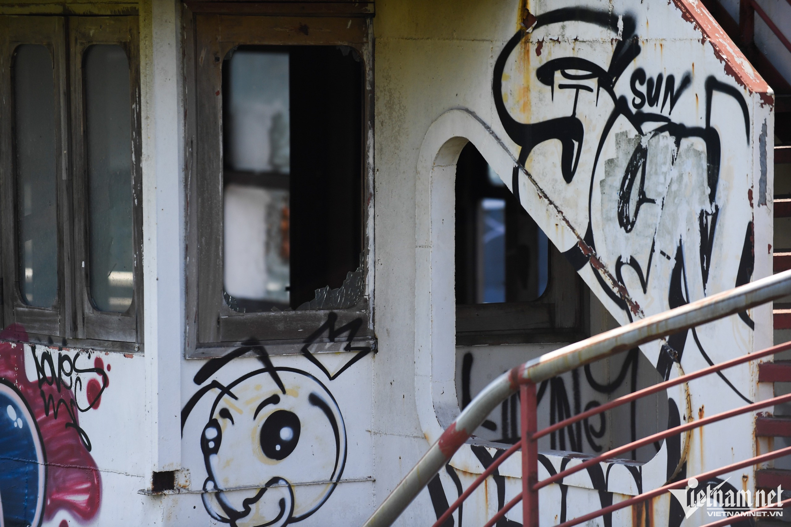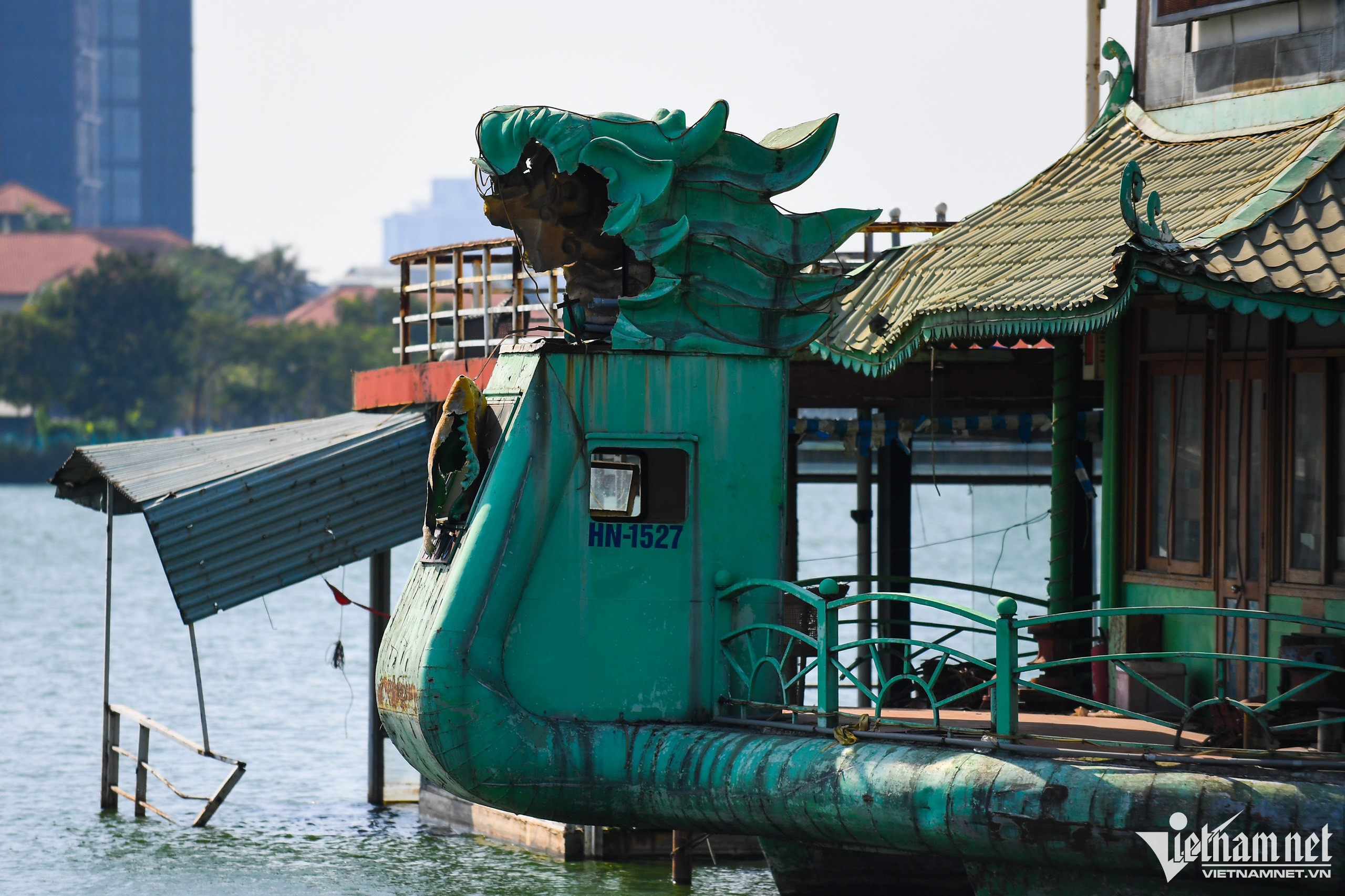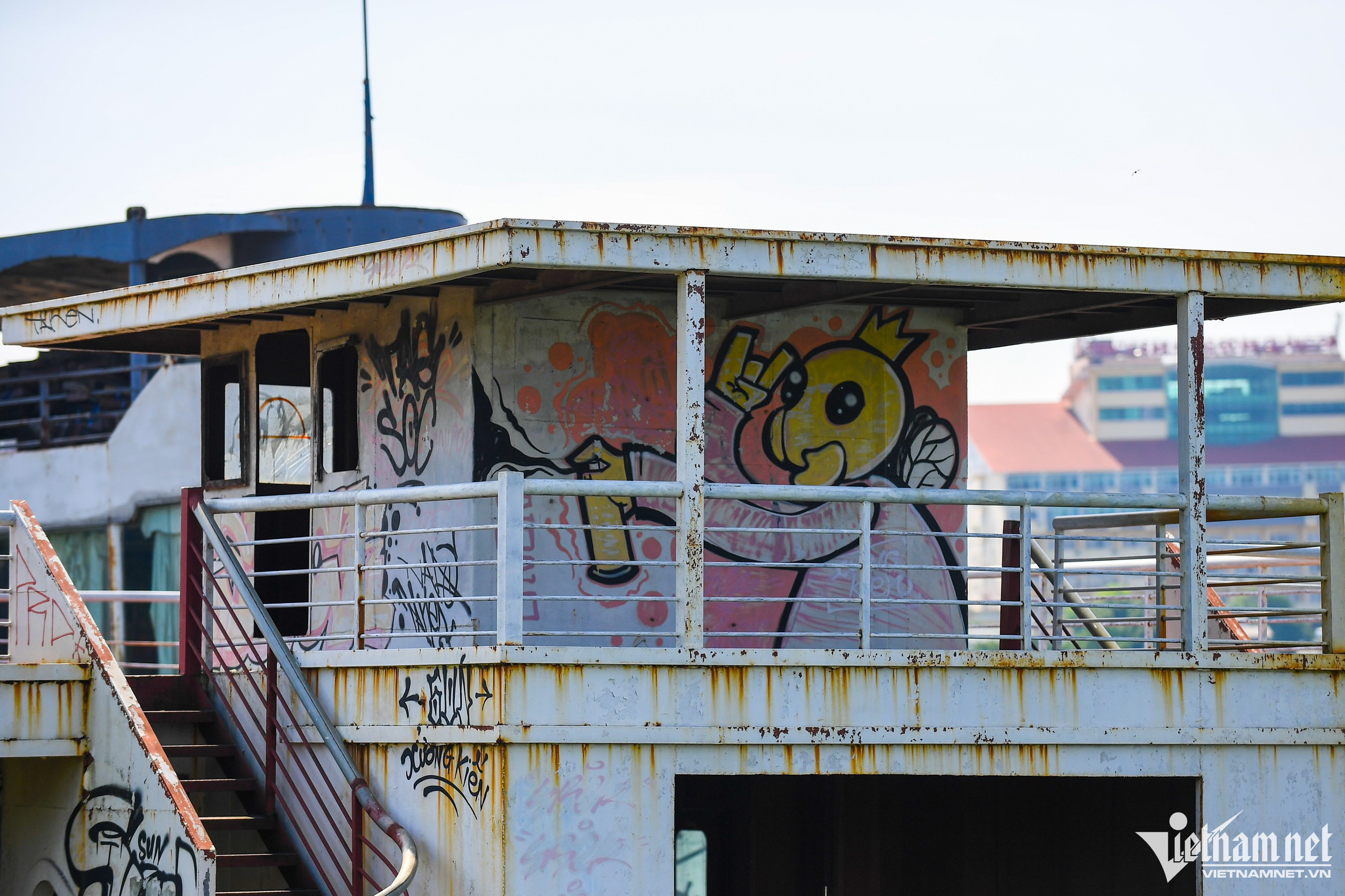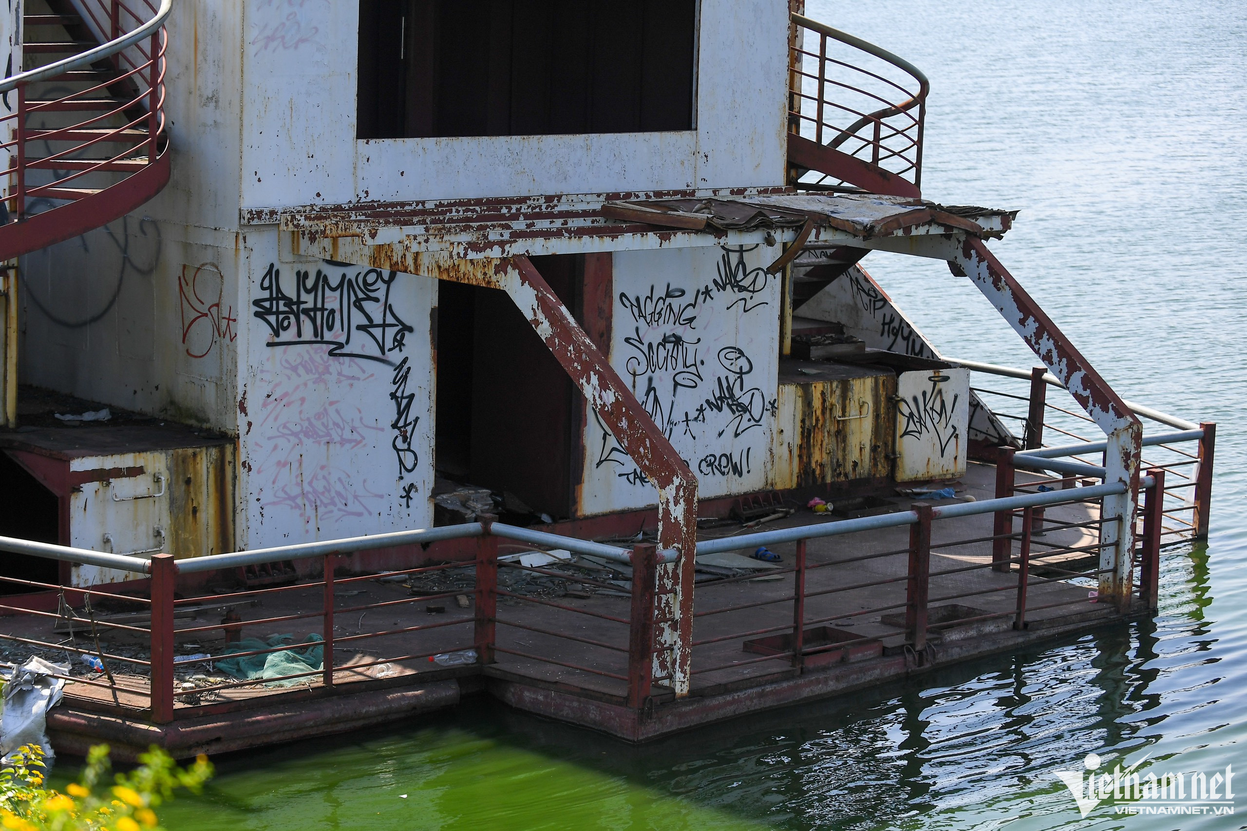 5 du thuyền - nhà hàng nổi cuối cùng trên hồ Tây (Hà Nội) trong tình trạng gỉ sét, bị vẽ bậy tràn lan, nhiều bộ phận đã thủng và được chắp vá tạm bợ. Hàng ngày khu vực này có một người trông coi.