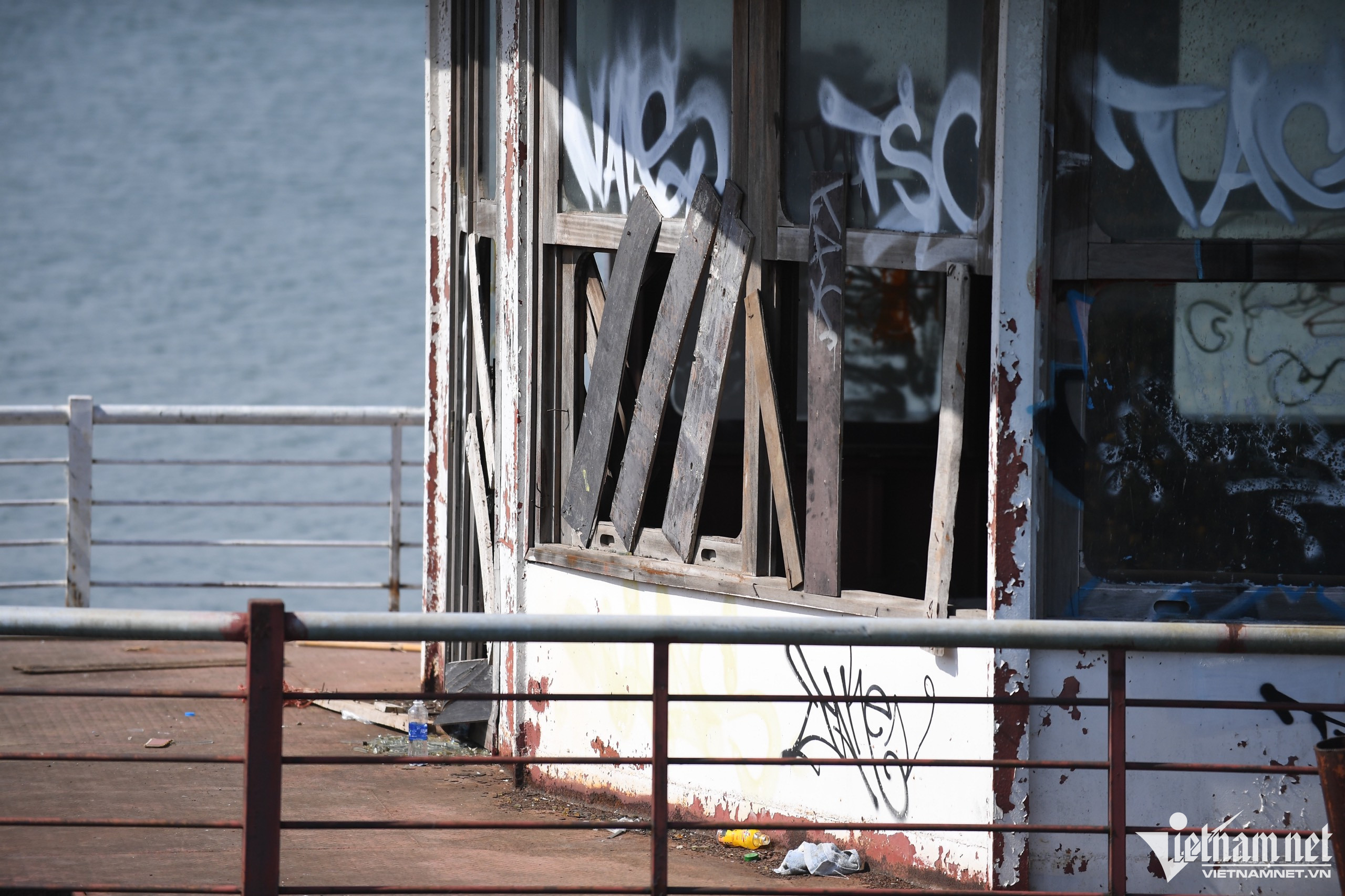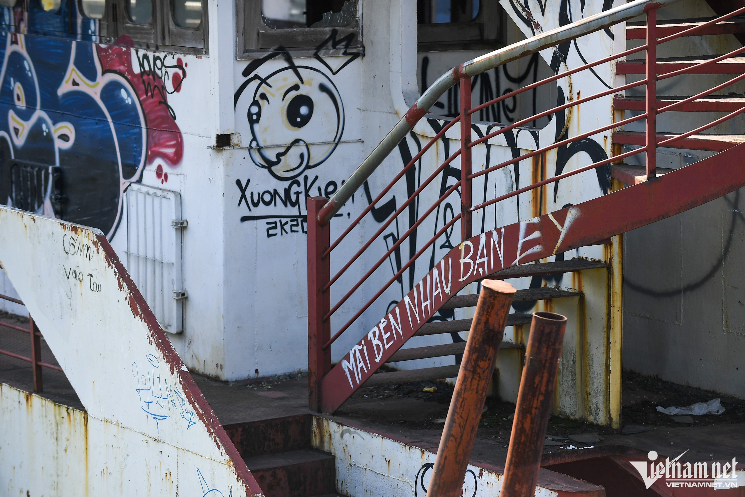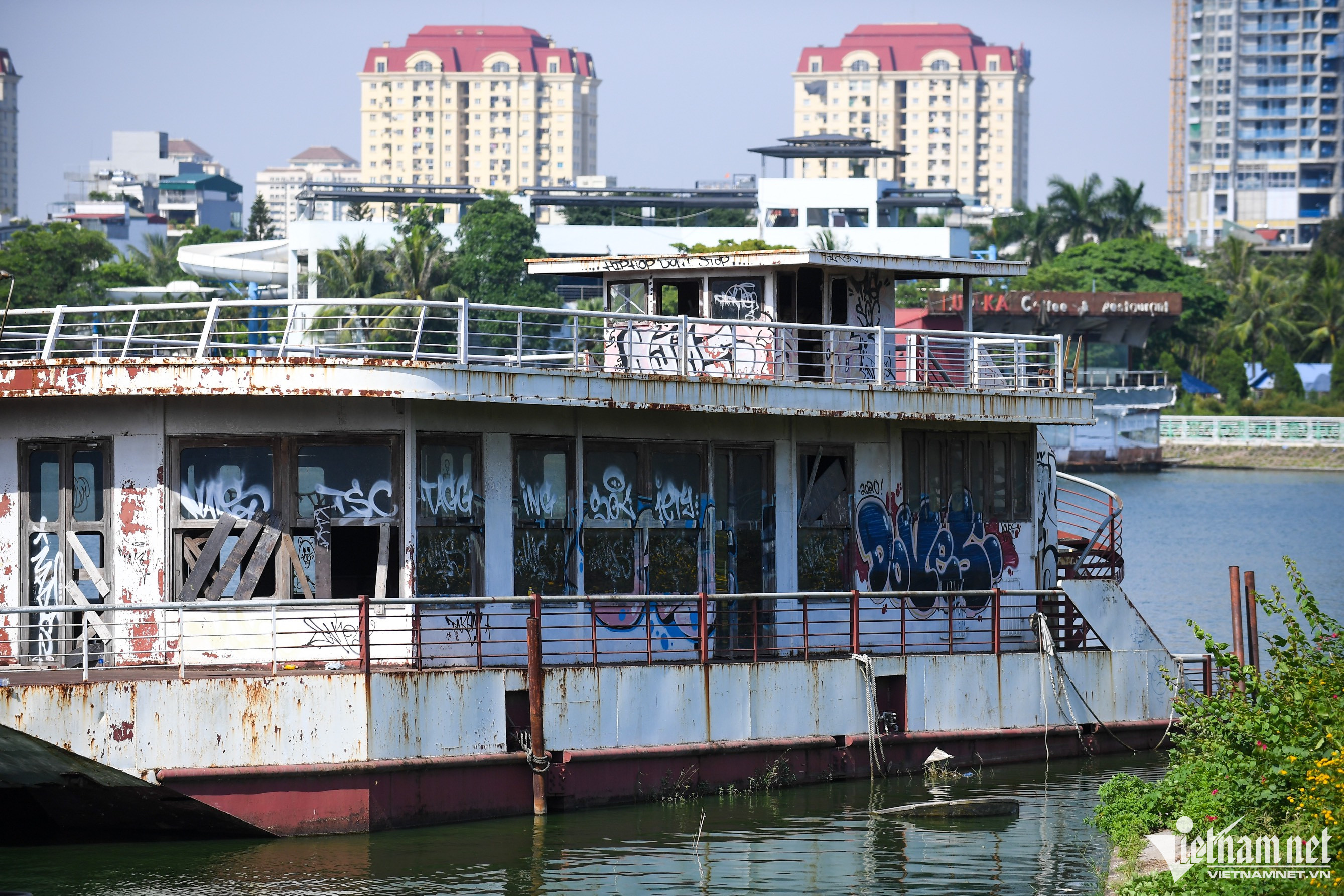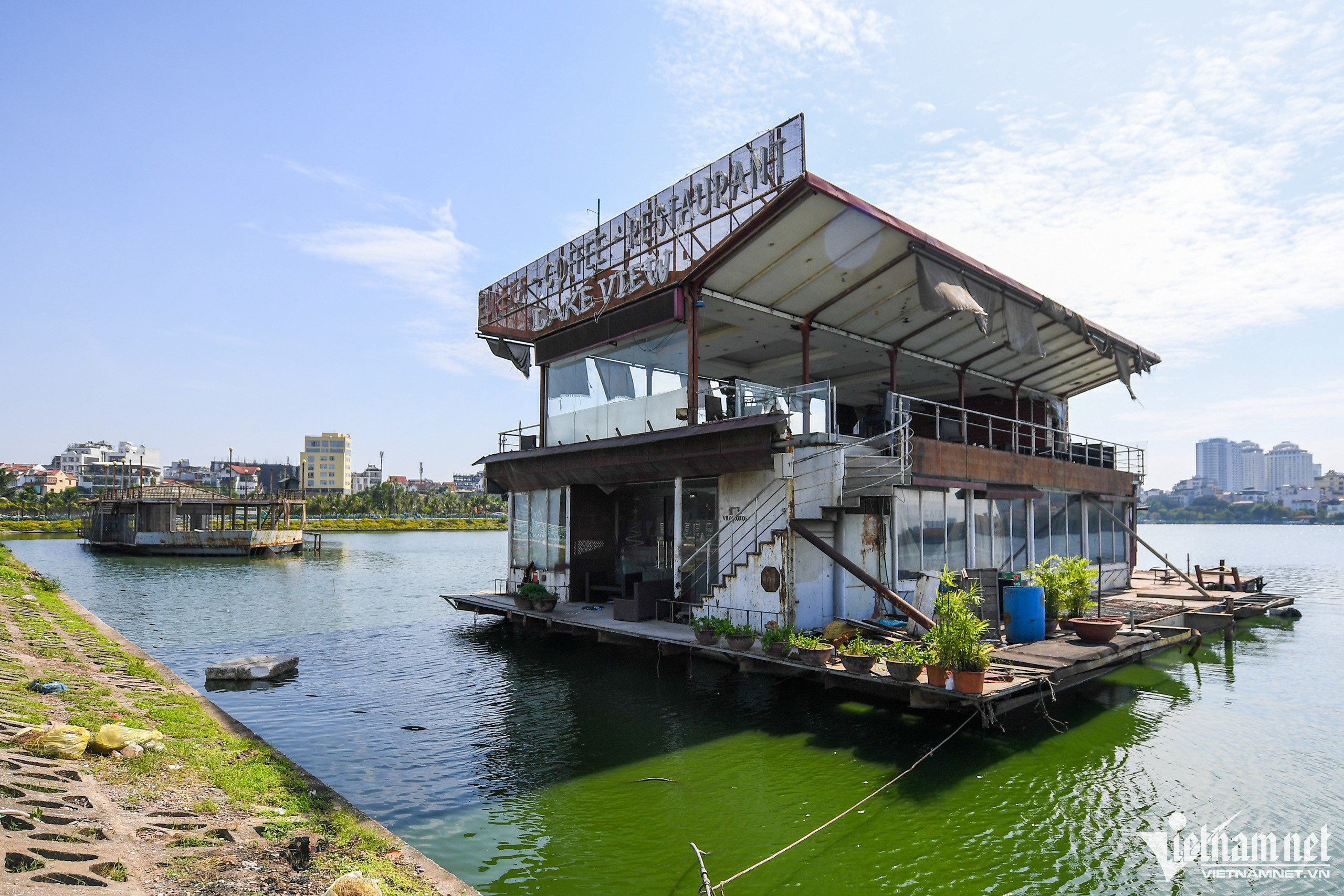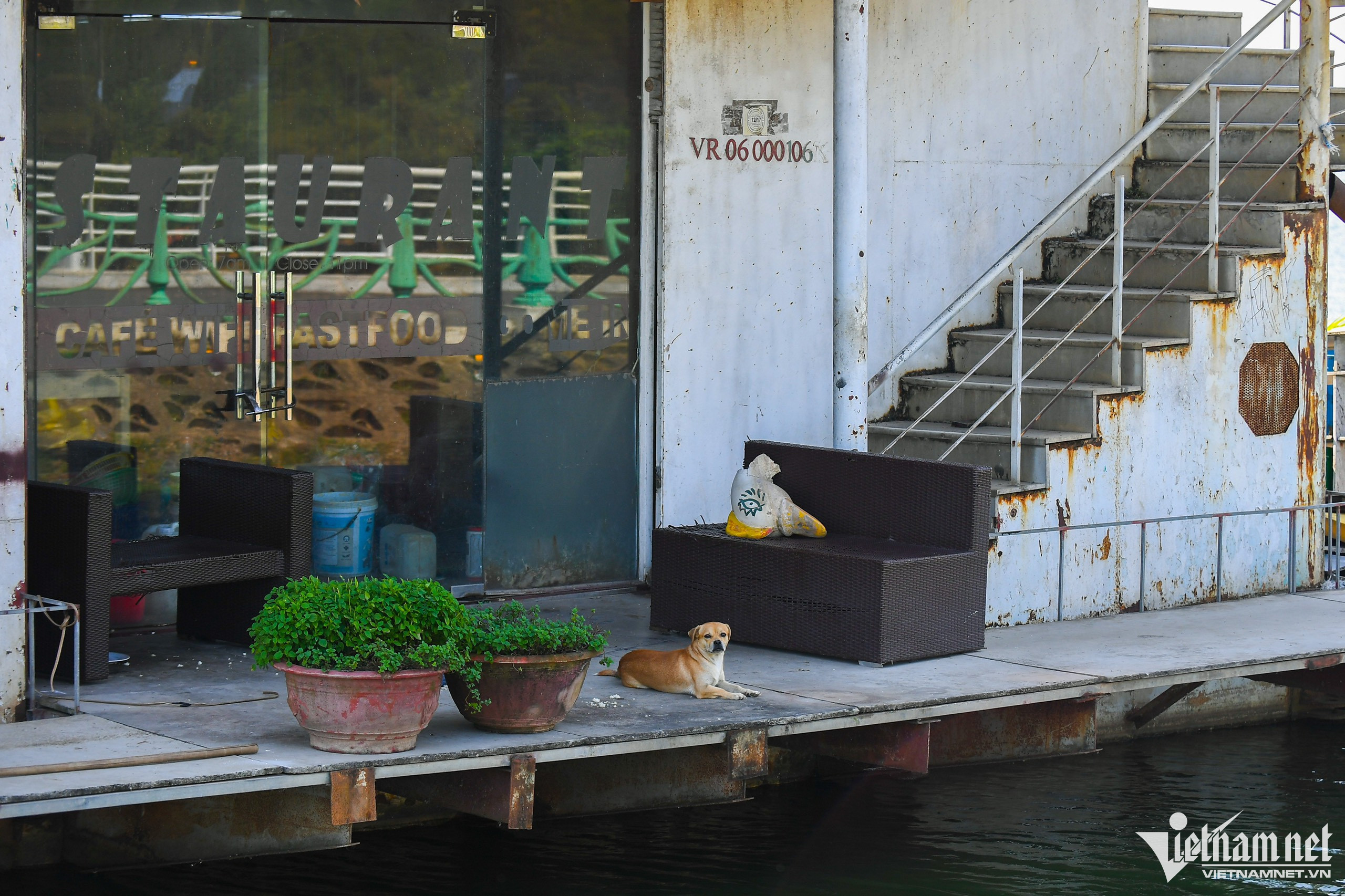 5 du thuyền - nhà hàng nổi cuối cùng trên hồ Tây (Hà Nội) trong tình trạng gỉ sét, bị vẽ bậy tràn lan, nhiều bộ phận đã thủng và được chắp vá tạm bợ. Hàng ngày khu vực này có một người trông coi.