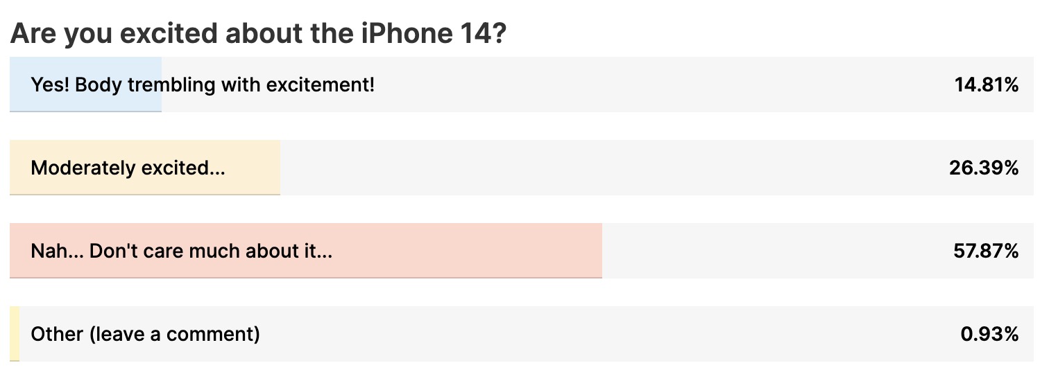 Theo khảo sát từ trang PhoneArena, gần 60% người xem của trang này không hứng thú với iPhone 14. Cụ thể hơn nữa, khảo sát từ SellCell cho thấy 86,8% người dùng Android chọn không mua thế hệ iPhone mới.