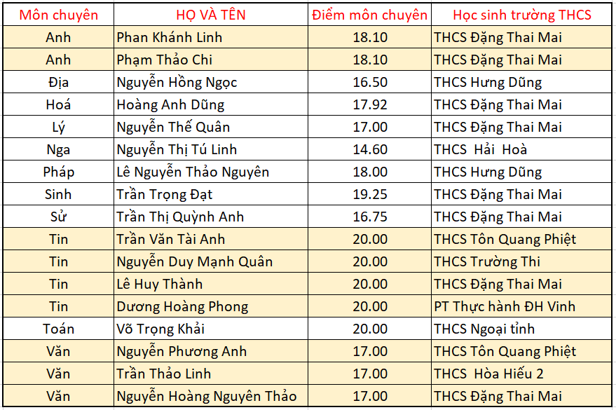 Em Trần Thị Quỳnh Anh có điểm chuyên cao nhất lớp Lịch sử với điểm số 16,75. Em Nguyễn Hồng Ngọc đứng đầu môn Địa lý với điểm số 16,5. Điểm cao nhất của môn tiếng Nga thuộc về em Nguyễn Thị Tú Linh với số điểm 14,6.