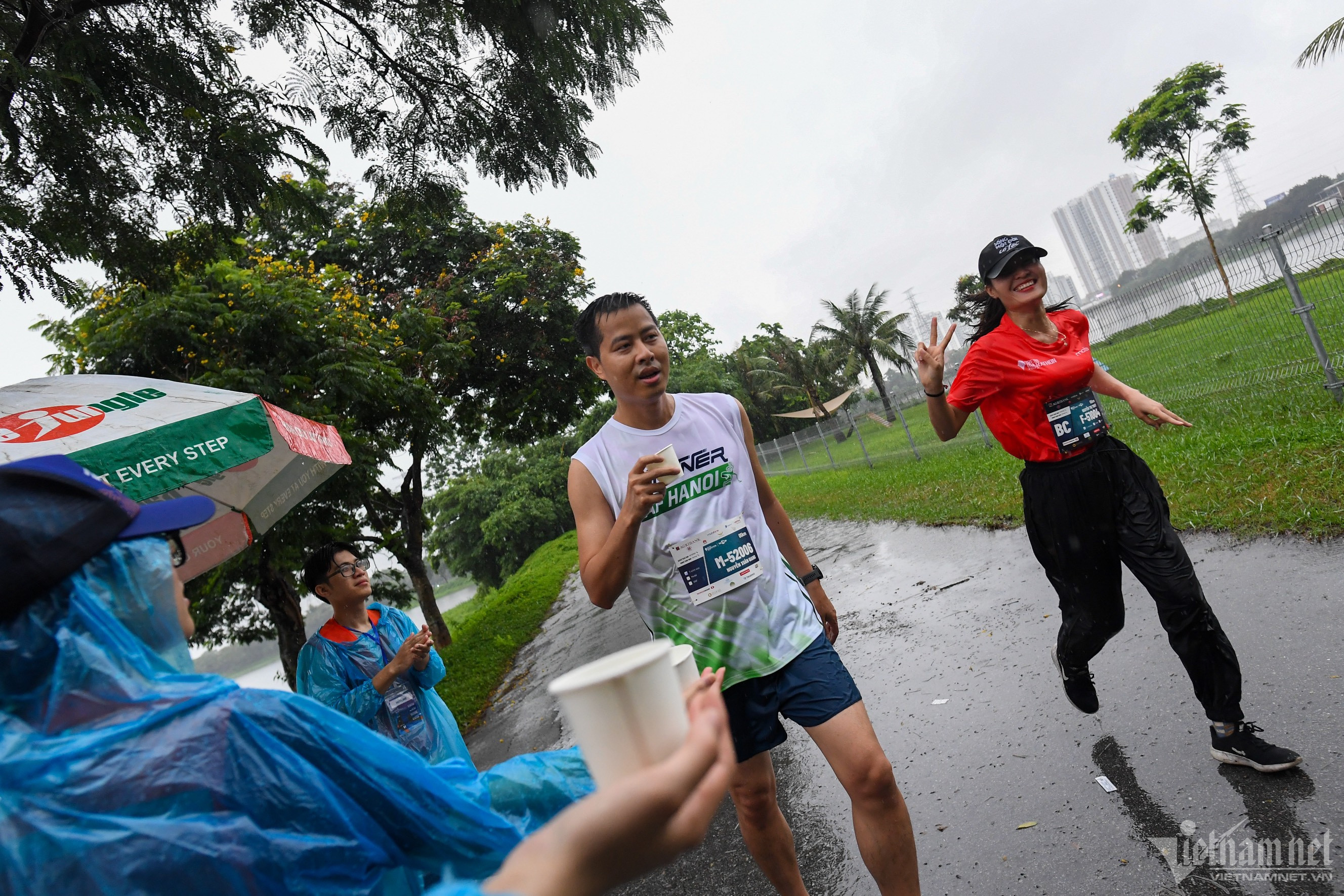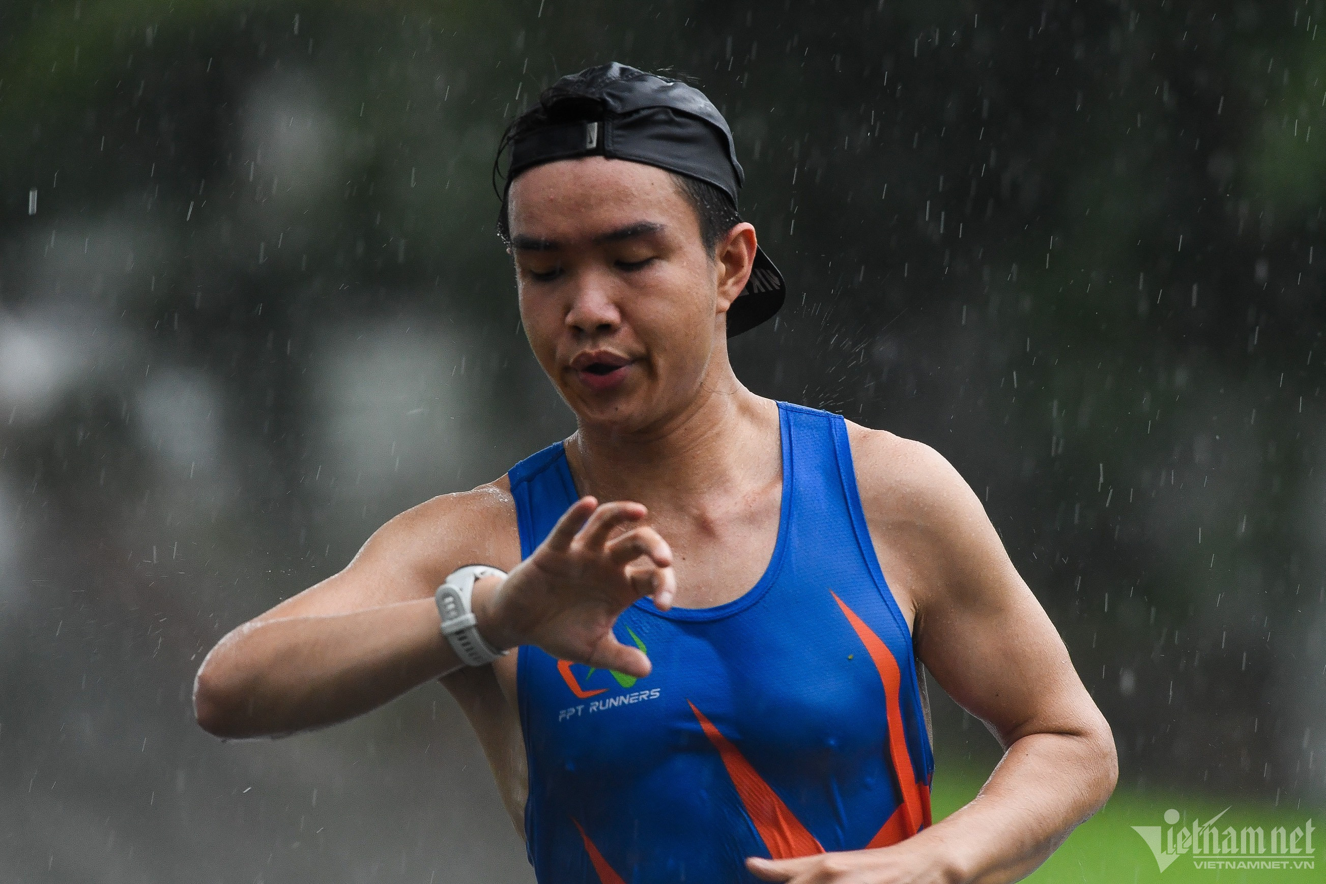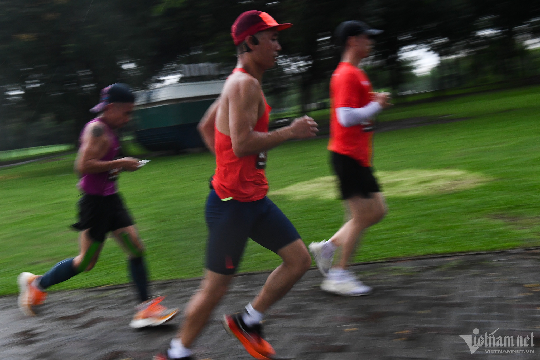 Mưa nặng hạt, đường trơn trượt nhưng không làm khó các "vận động viên". Một số người vẫn hào hứng tạo dáng trên đường chạy khi nhìn thấy ống kính máy ảnh.