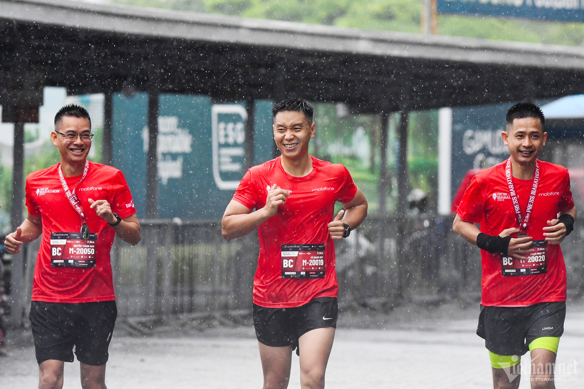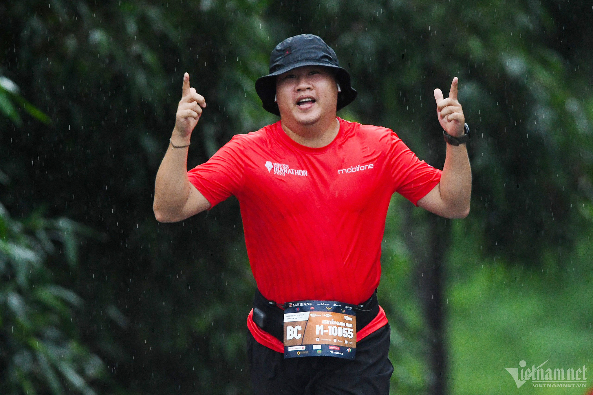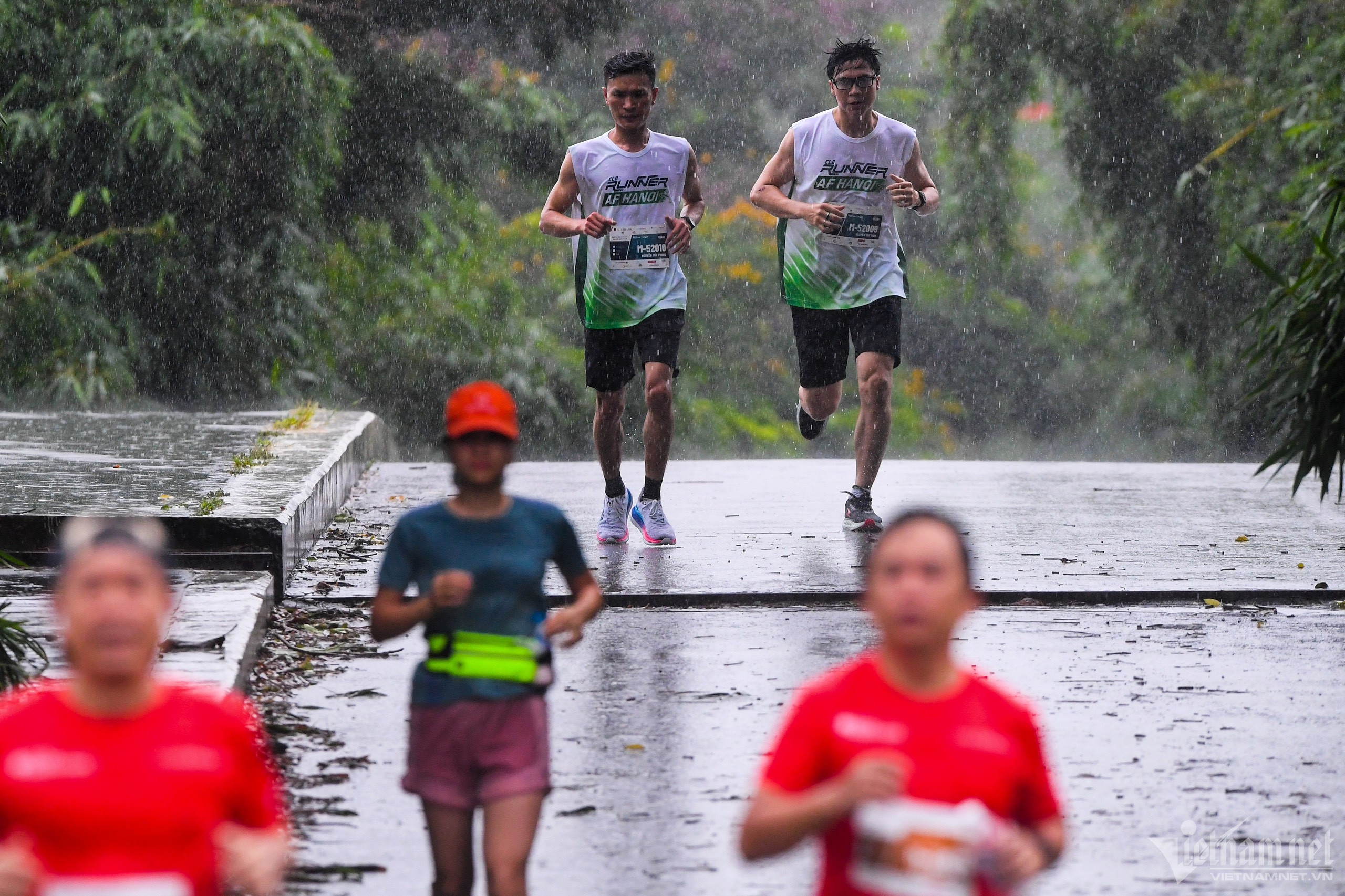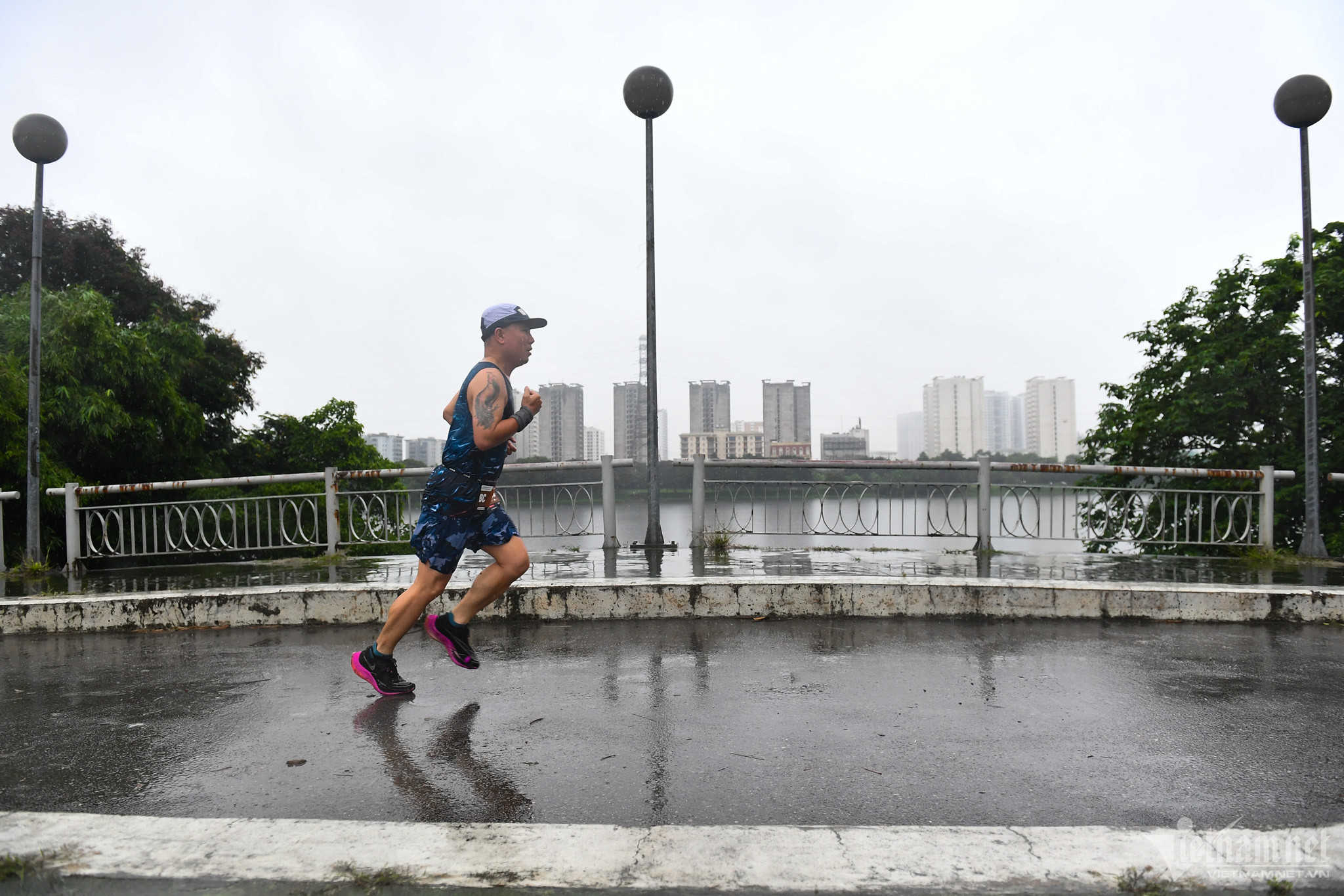 Mưa nặng hạt, đường trơn trượt nhưng không làm khó các "vận động viên". Một số người vẫn hào hứng tạo dáng trên đường chạy khi nhìn thấy ống kính máy ảnh.