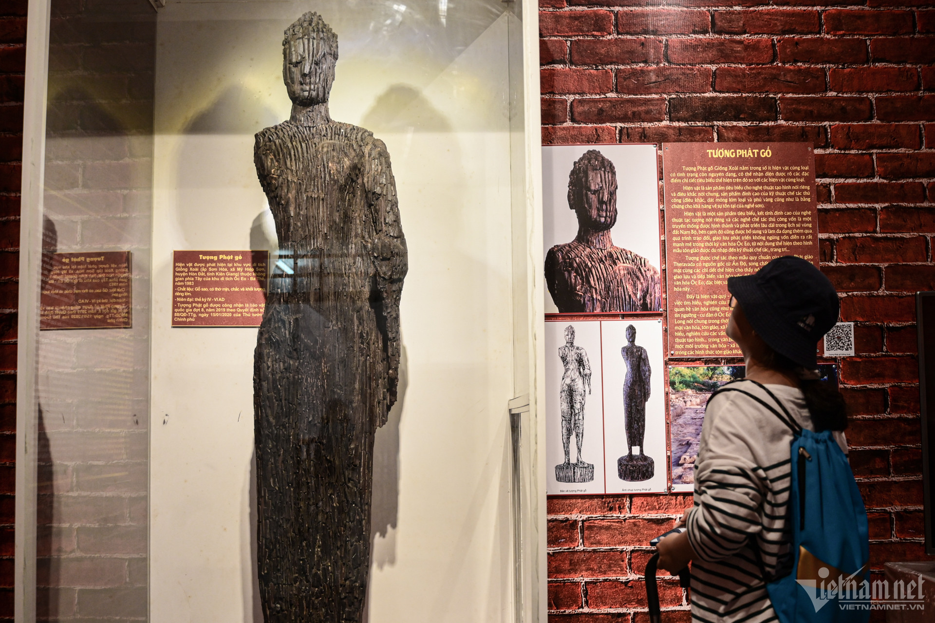 Tượng Phật Giồng Xoài có niên đại thế kỷ IV-VI, được làm bằng gỗ sao nguyên khối, cao 2,7m, nặng 94kg, được công nhận là bảo vật quốc gia năm 2019.