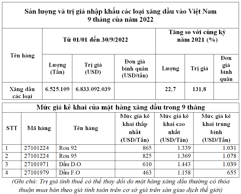 Cung cấp thông tin về công tác quản lý hoạt động xuất nhập khẩu xăng dầu 9 tháng vừa qua, Tổng cục Hải quan cho biết sản lượng nhập khẩu các loại xăng dầu vào Việt Nam là hơn 6,5 triệu tấn trị giá hơn 6,8 tỷ USD, tăng 22,7% về lượng và tăng đột biến 131,8% về giá trị so với cùng kỳ năm 2021.