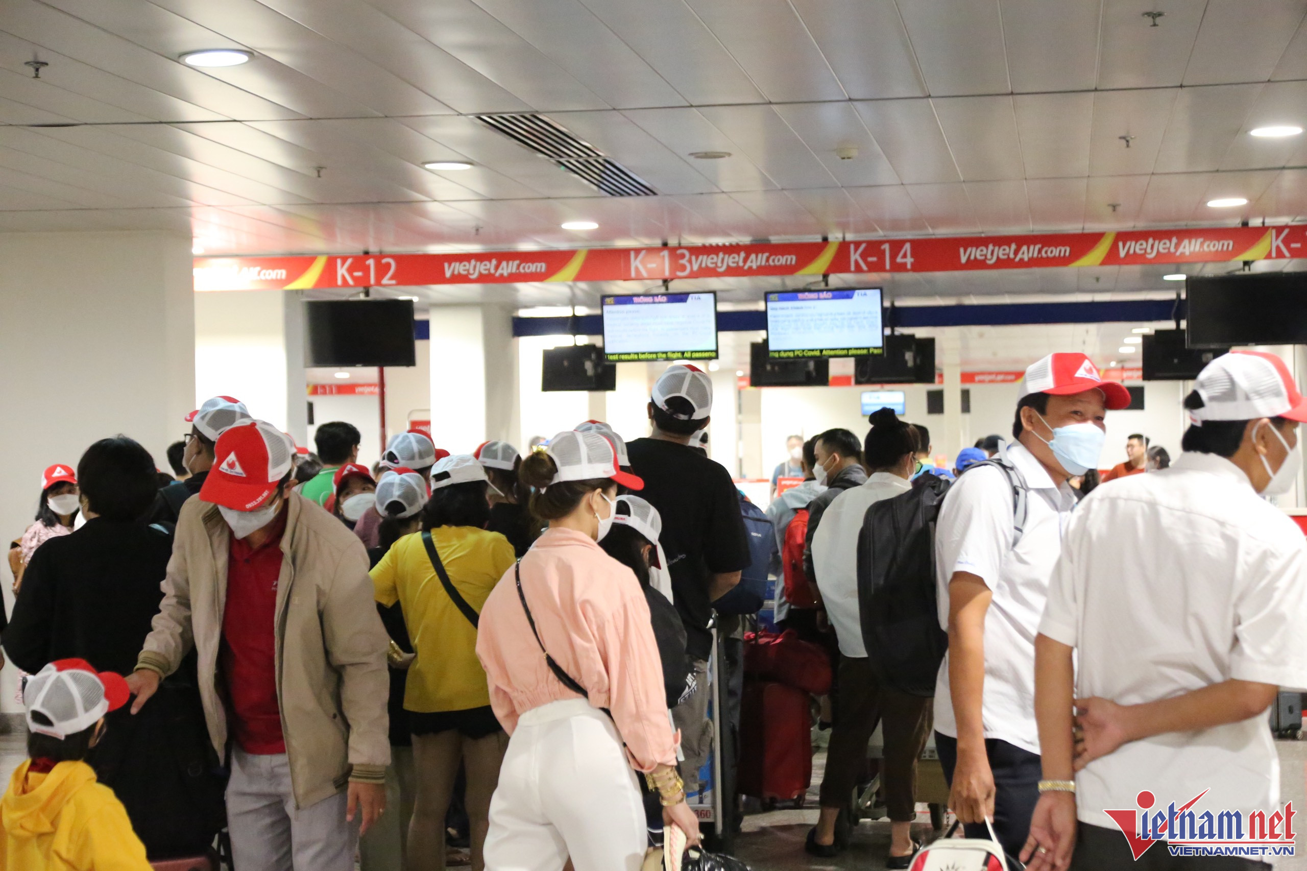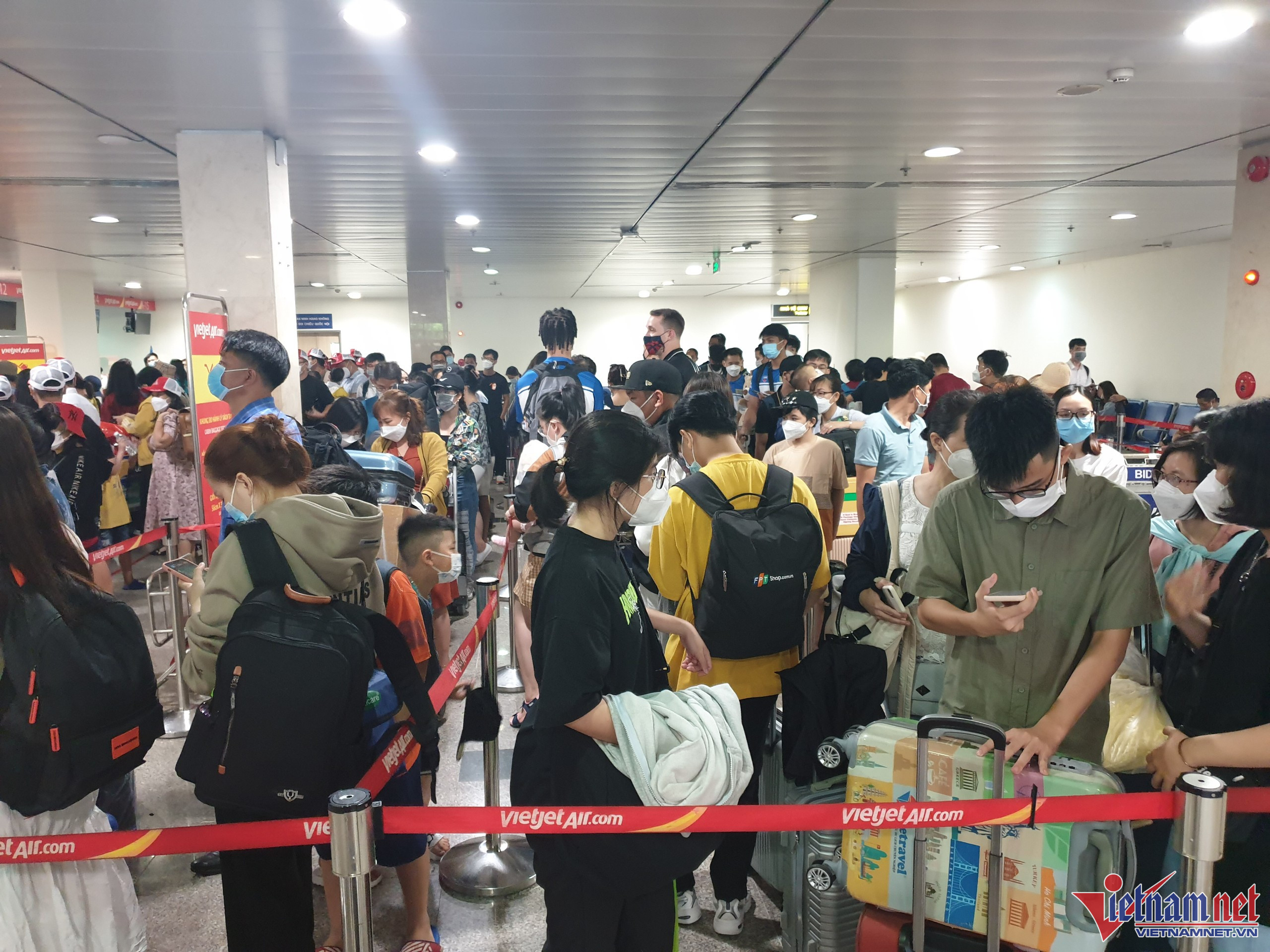 Ghi nhận tại khu vực làm thủ tục của hãng hàng không Vietjet Air, hành khách phải xếp hàng dài. Mặc dù đông đúc hành khách nhưng không xảy ra tình trạng chen lấn quá tải.