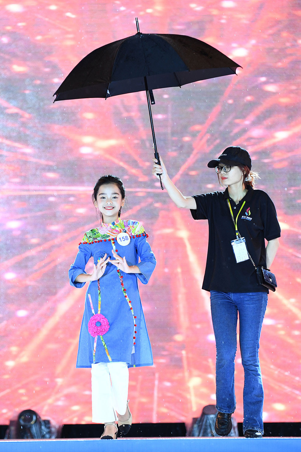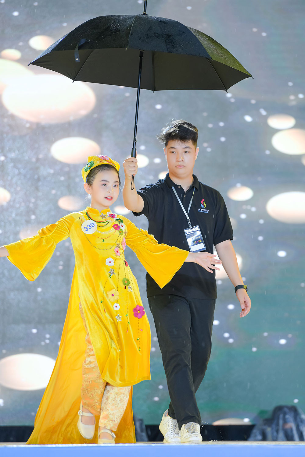 Mặc dù trời mưa 60 mẫu nhí vẫn trình diễn say sưa trên sân khấu.