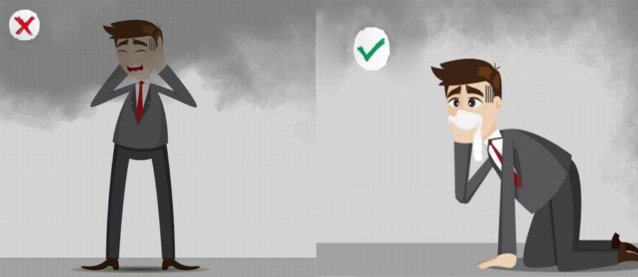 Các chuyên gia lưu ý rằng mối đe dọa lớn nhất trong một đám cháy xuất phát từ khói carbon monoxide. Để tránh hít phải khói độc, bạn phải cúi thấp người khi di chuyển, thậm chí phải bò dưới sàn vì khói luôn luôn bay lên cao. Hãy dùng khăn thấm nước che mặt, đóng hết các cửa lớn và cửa sổ lại để cô lập đám cháy.
