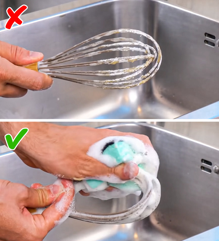 Có những ngóc ngách khó tiếp cận nên chúng ta có thể gặp khó khăn khi rửa máy đánh trứng. Một giải pháp hiệu quả cho việc này là dùng miếng bọt biển để rửa, đảm bảo sẽ không có chút bụi bẩn nào bị mắc kẹt.