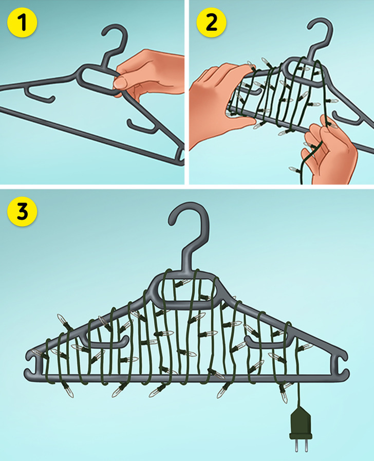 Thay vì vứt lung tung, túm lại thành một túm rất rối thì bạn có thể quấn đèn nháy quanh một cái móc quần áo. Cách này giúp đèn không bị hỏng. Bạn lại có thể treo lên ở bất cứ đâu mà không chiếm nhiều diện tích.