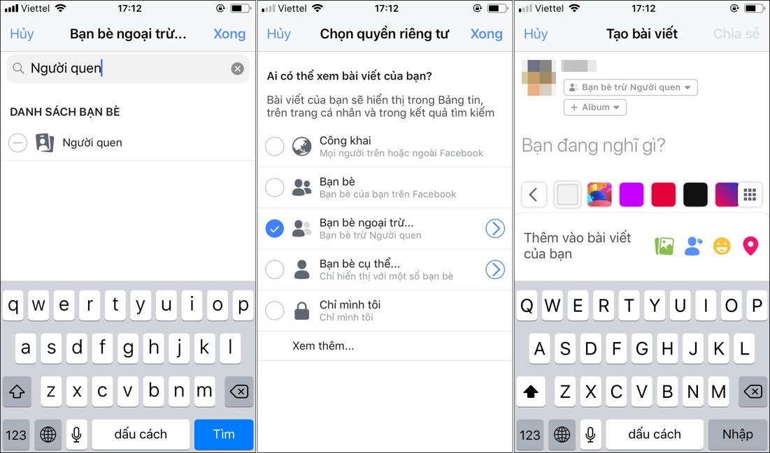 Tiếp theo, mỗi khi đăng bài viết, bạn chọn chế độ xem là Friends except (Bạn bè ngoại trừ). Sau đó, bạn nhập từ khóa Acquaintances (Người quen) vào ô tìm kiếm và chọn mục tương ứng từ danh sách kết quả.