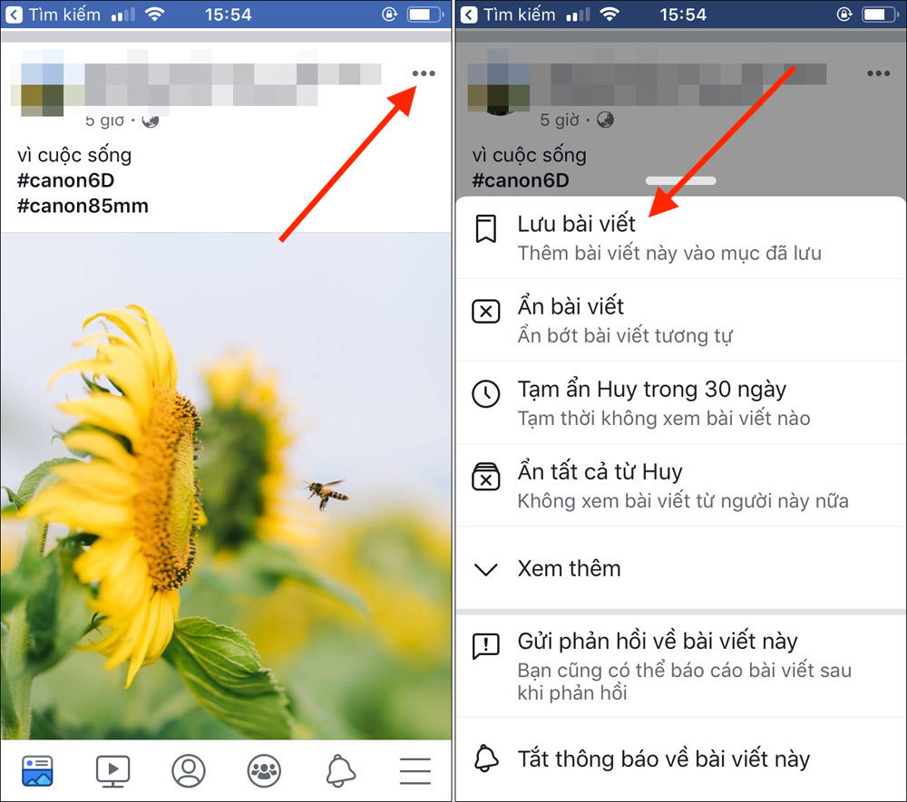 Khi bạn thấy một bài viết trên dòng thời gian, hãy bấm nút hình dấu chấm lửng và chọn Save link/post/video (Lưu liên kết/bài viết/video).