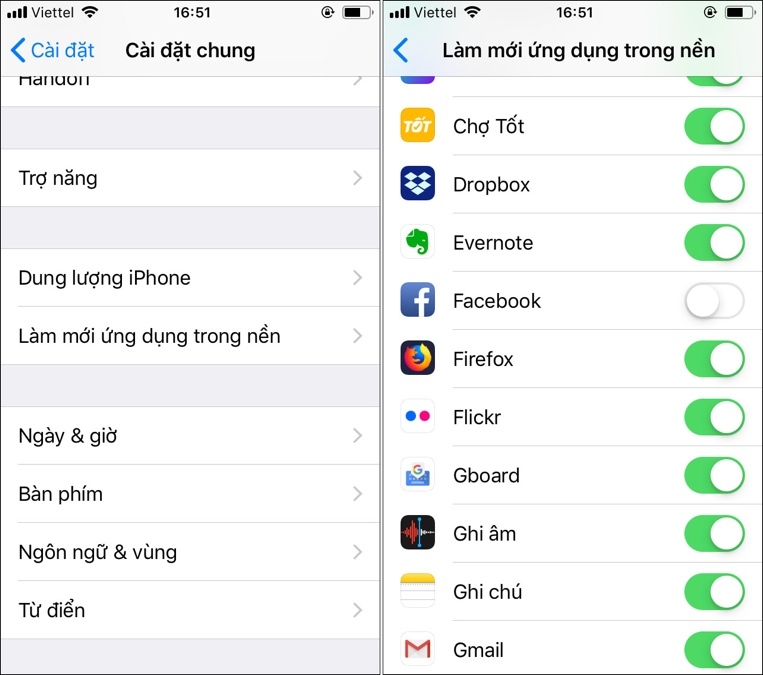 Tiếp theo, bạn tìm ứng dụng Facebook và tắt công tắc bên cạnh nó. Thao tác này đảm bảo Facebook không chạy các tiến trình nền không cần thiết. Nhờ đó, ứng dụng sẽ tiêu thụ ít điện năng hơn.