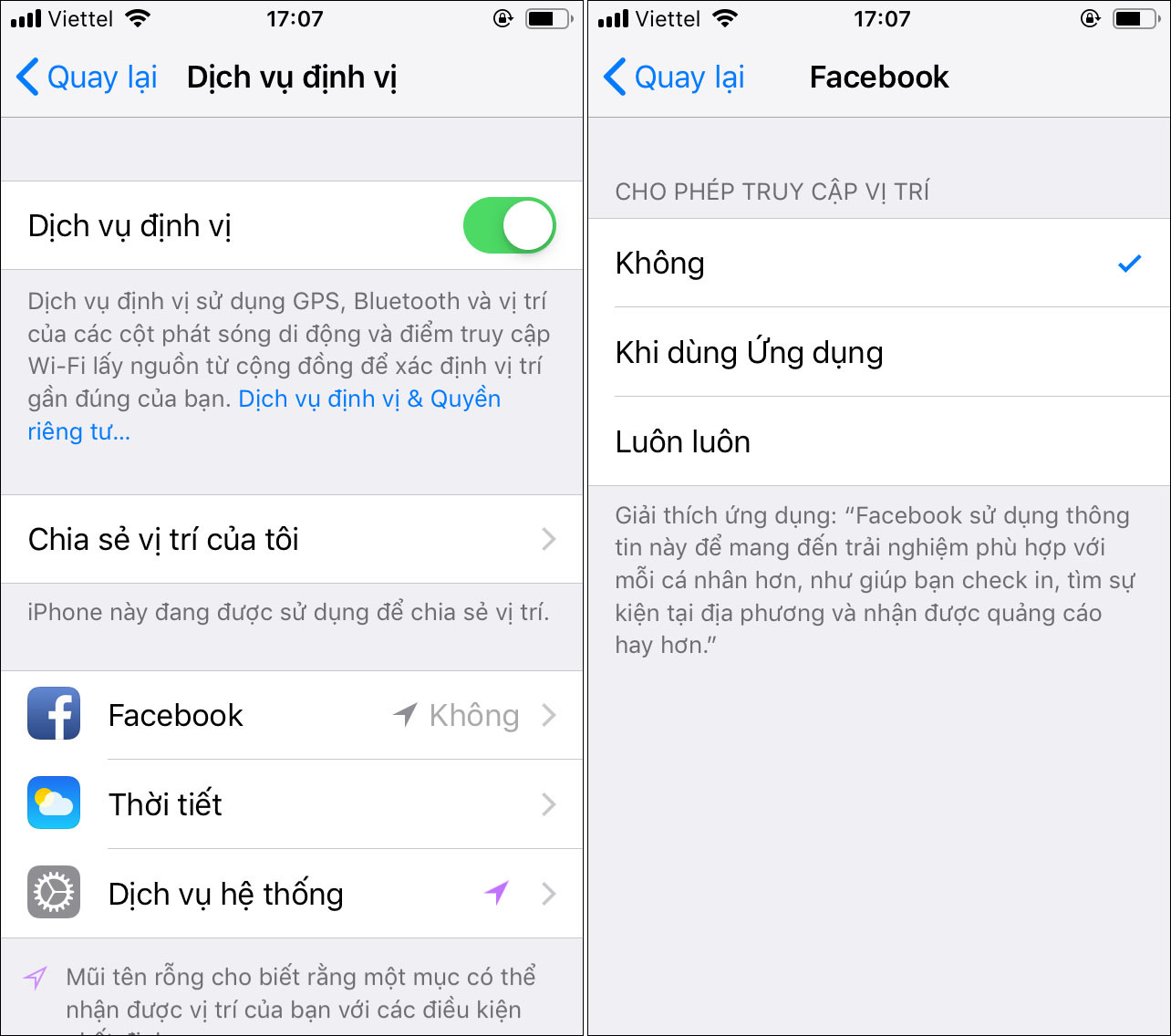 Trên ứng dụng Settings (Cài đặt), bạn chọn Privacy (Quyền riêng tư) và chọn Location Services (Dịch vụ định vị). Tìm ứng dụng Facebook trong danh sách, chọn nó và ở màn hình tiếp theo, bạn chọn Never (Không).