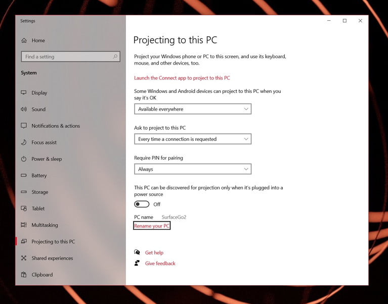 Sau khi tính năng này được thêm vào, bạn có thể cấu hình cả 2 PC của mình để truyền tải hình ảnh. Trên PC chủ và PC phụ, hãy truy cập vài Settings -> Projecting to this PC. Tại đây, hãy nhấp vào tùy chọn mà bạn muốn, bao gồm Available everywhere (có sẵn mọi lúc), Every time a connection is requested (mỗi khi một kết nối được thiết lập) và Never (không bao giờ). Trong mục cuối cùng, hãy chuyển sang Off (Tắt).
