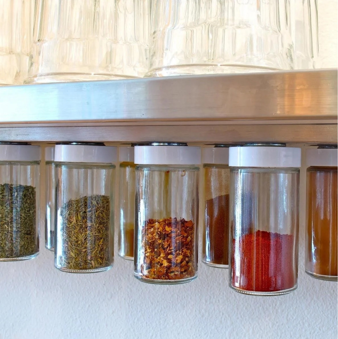 Đây là một xu hướng lưu trữ sáng tạo, đầy mới mẻ mà bạn có thể tham khảo cho căn bếp gia đình ngay hôm nay. Để làm được việc này, bạn cần lắp đặt thanh kim loại bên dưới tủ bếp và nam châm vào phần nắp các lọ gia vị.
