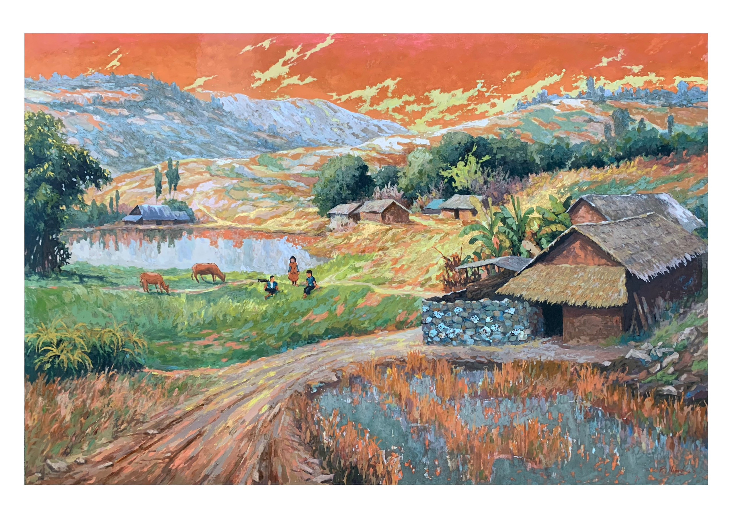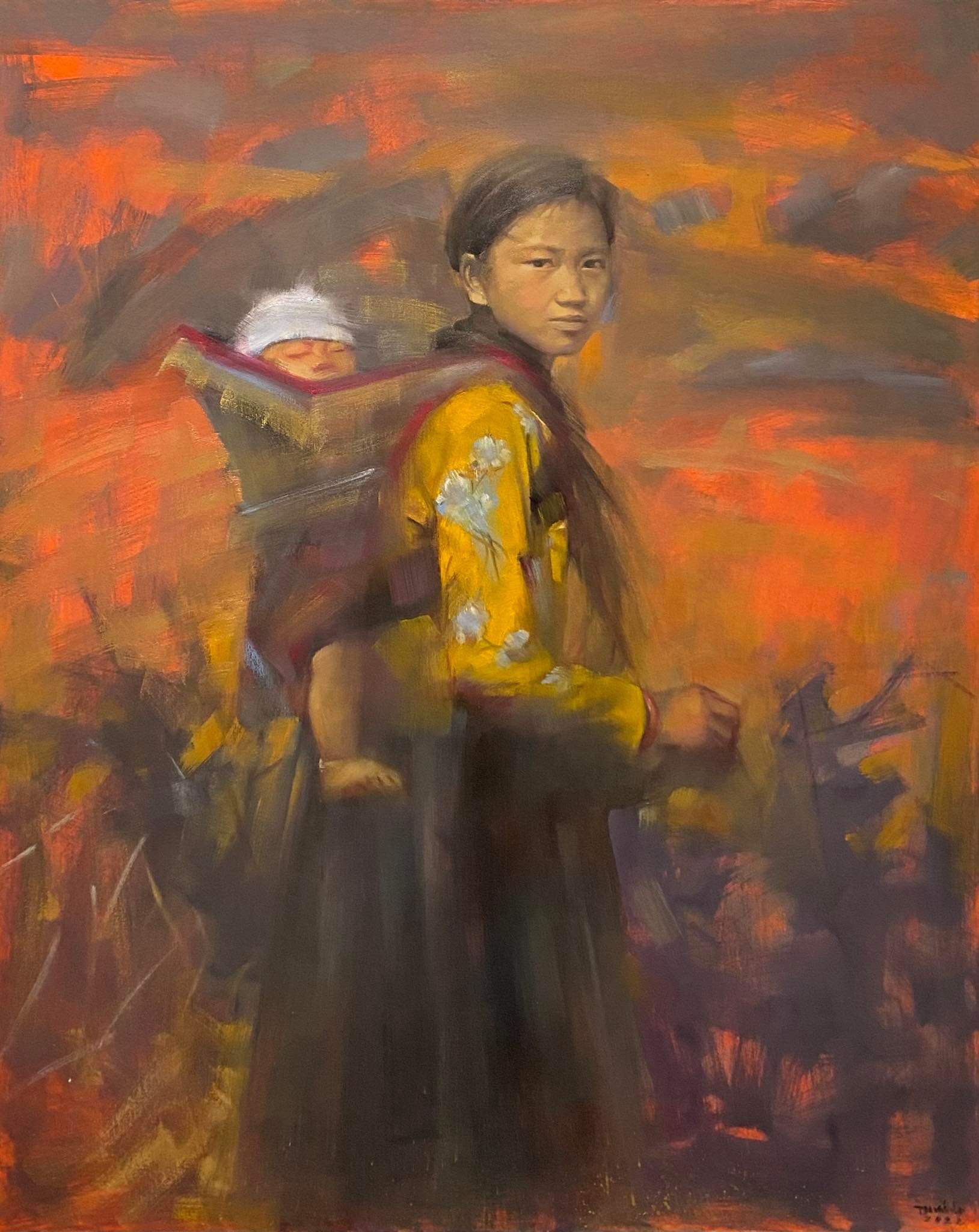 Họa sĩ Ngụy Đình Hà tham gia với bức 'Đường về nhà' vẽ chân dung em bé vùng cao với bảng màu tương phản rực rỡ.