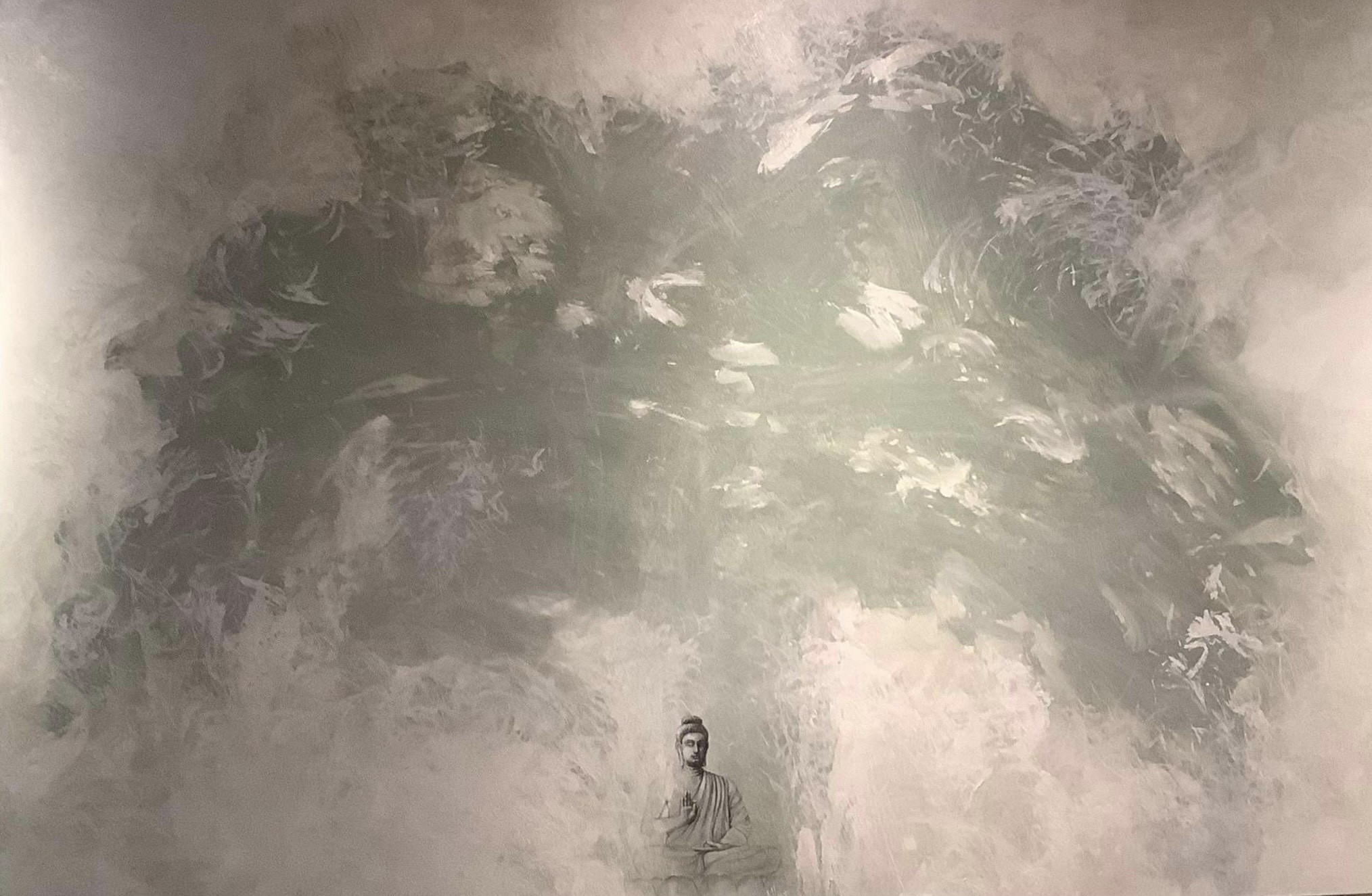 Họa sĩ Trần Nhật Thăng với tác phẩm kích thước lớn chủ đề 'Vitarka Mudra - Biện minh thủ ấn'. Tác phẩm đặt chân dung tượng Đức Phật trên nền tranh trừu tượng có giá trị 700 triệu đồng.