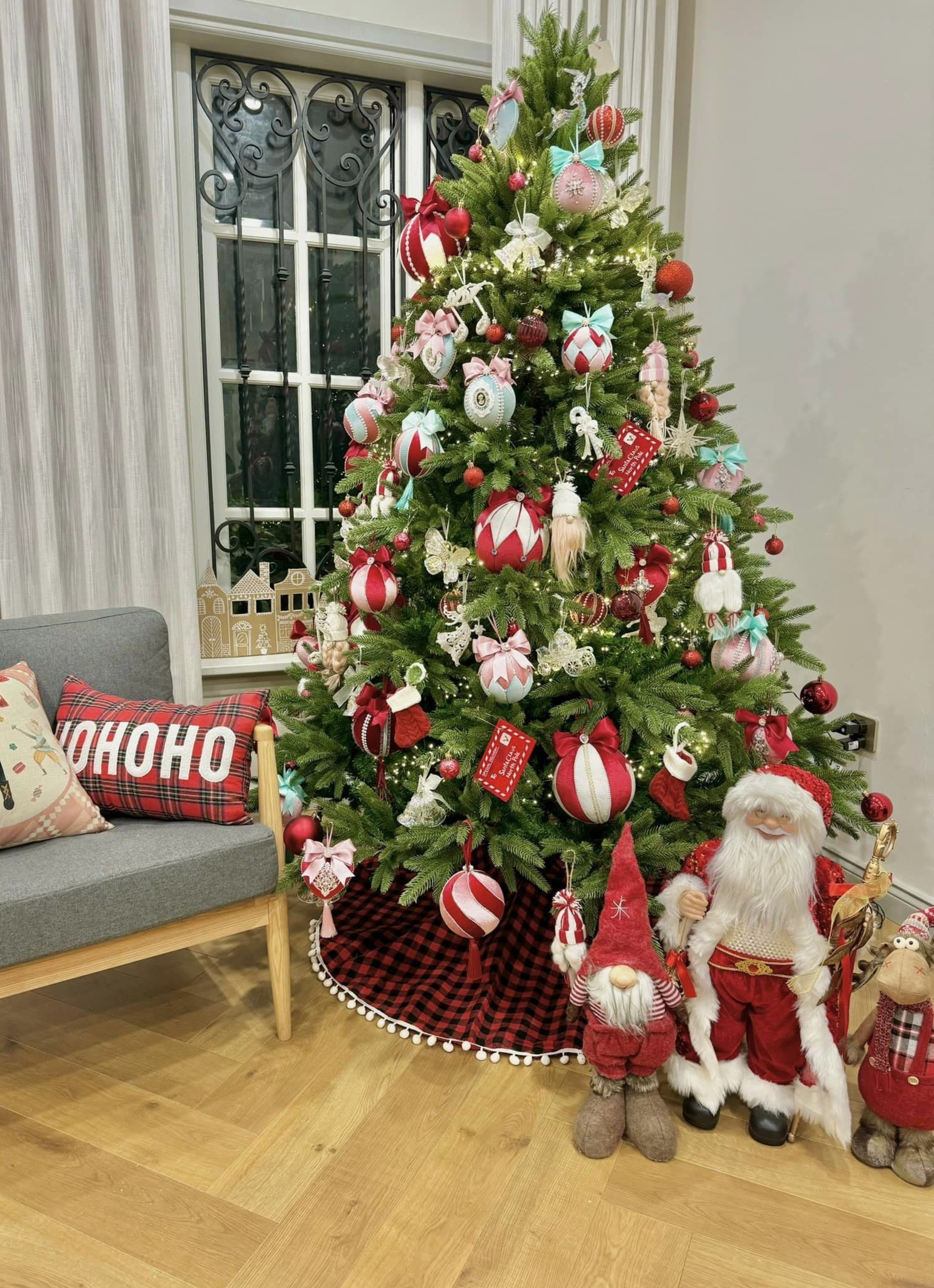 Cây thông cao 1m8 được trang trí bởi 31 quả châu to nhỏ nhiều kích cỡ theo tone màu đỏ - hồng - xanh mint.