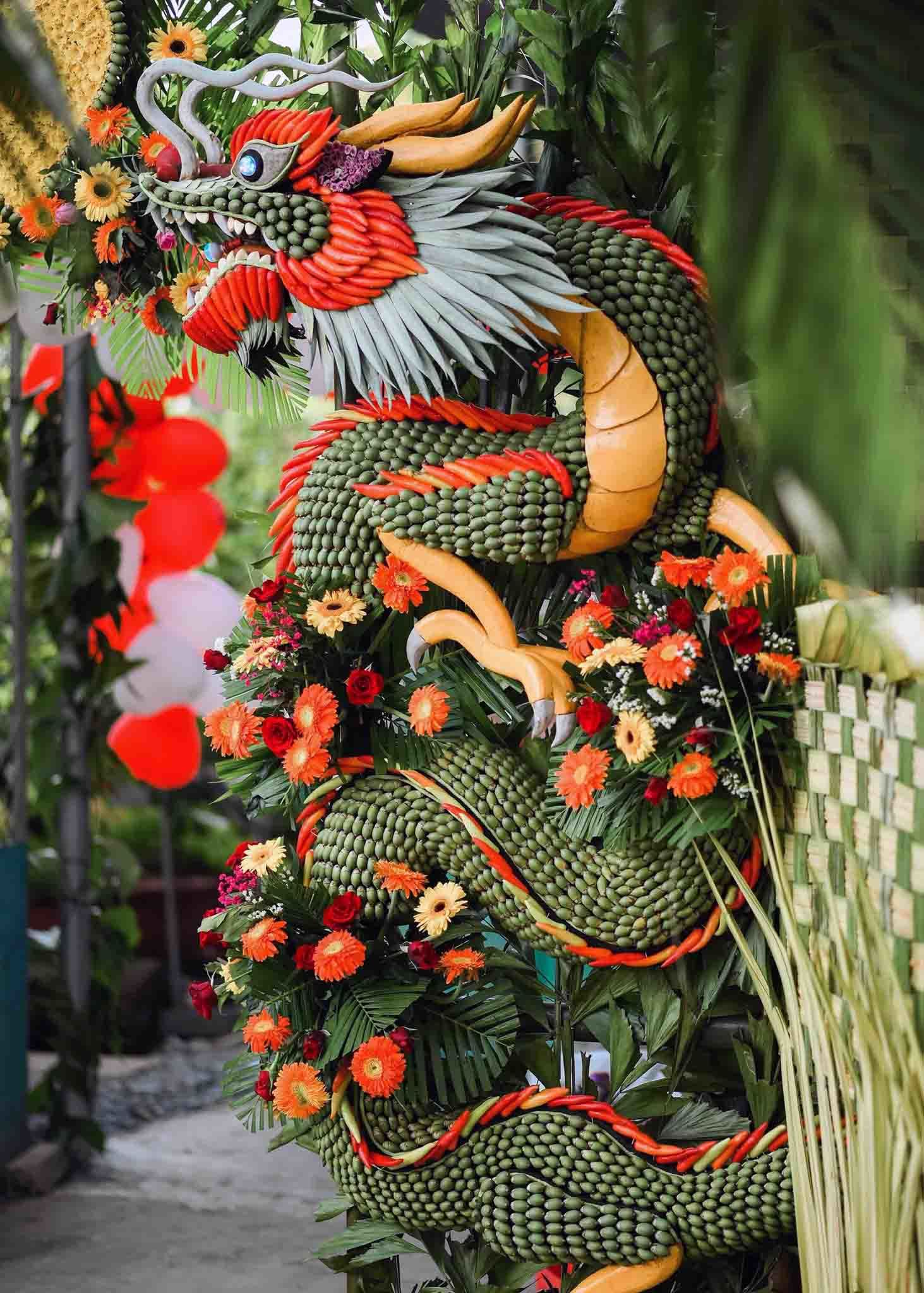 Để làm hình tượng đầu rồng, anh Tâm dùng khung bằng tre. Anh tạo hình con rồng bằng xốp sau đó dùng đinh nhỏ để đính các loại trái cây và hoa vào. Trên thân rồng có những trái cau xếp sát nhau làm vảy; ớt dùng làm vây lưng, lá dứa làm bờm, đậu que dùng để viền đôi mắt và miệng, củ tỏi bóc vỏ dùng làm răng.