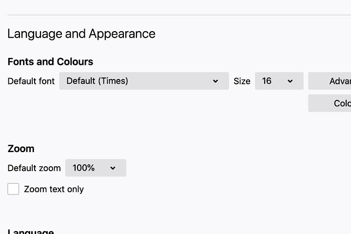 Bạn sẽ tìm thấy các tuỳ chọn tương tự trong mục Appearance của Settings đối với Google Chrome, và trong mục Language and Appearance thuộc tab General của trang Preference đối với Mozilla Firefox. Safari không cung cấp các tuỳ biến như vậy.