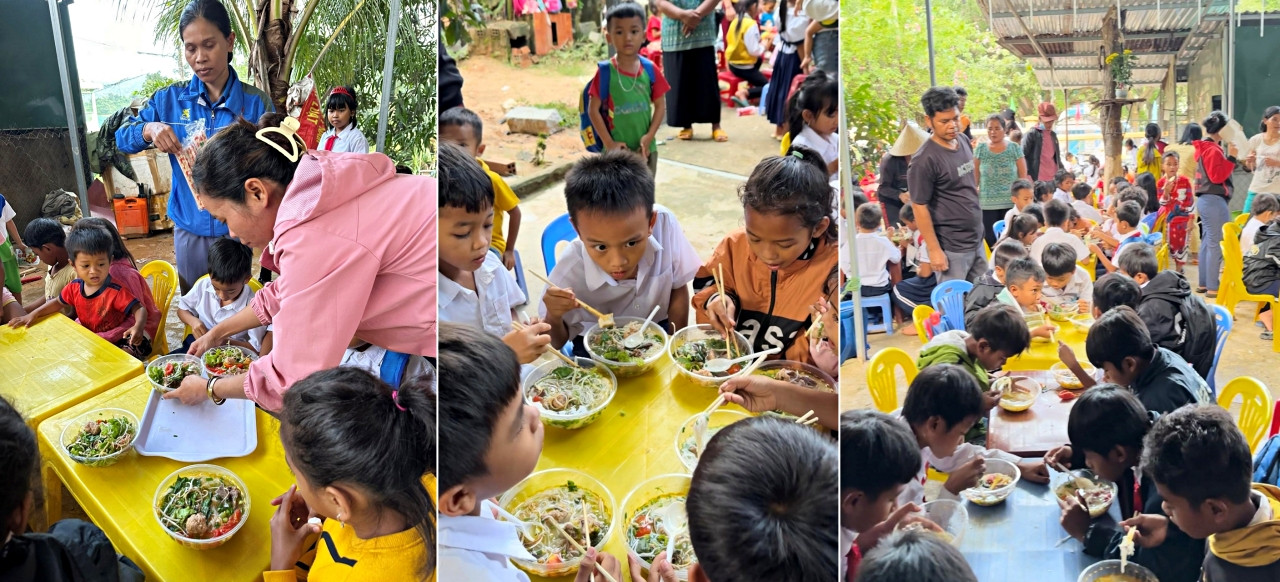 8h sáng, trong căn bếp dựng tạm tại nhà dân, chị Nguyễn Thị Ngọc Trinh (29 tuổi, huyện Cam Lâm, tỉnh Khánh Hòa) cùng nhóm bạn tất bật chế biến, nấu nồi bún riêu cực lớn. Thực khách của Trinh hôm nay là hơn 250 học sinh của Trường Tiểu học Sơn Tân (xã Sơn Tân).